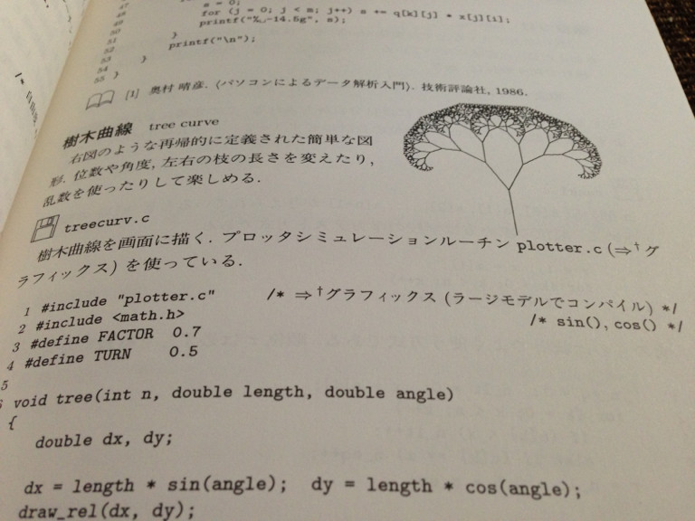 樹木曲線 tree curve、再起呼び出しによるフラクタルぽい。 - C言語による最新アルゴリズム事典 (ソフトウェアテクノロジー) / 奥村晴彦 http://mono.hatena.ne.jp/mono/wtmdEigS6K#/nilab/wtqUtxkjbi