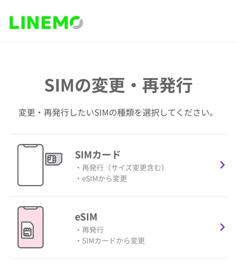 「機種変更をしたため交換/再発行したい」のところから https://g13.care.linemo.jp/sim-select へ SIMカードの交換やeSIM再発行はできますか?|よくあるご質問(FAQ)|【公式】LINEMO - ラインモ https://www.linemo.jp/support/faq/view/27266