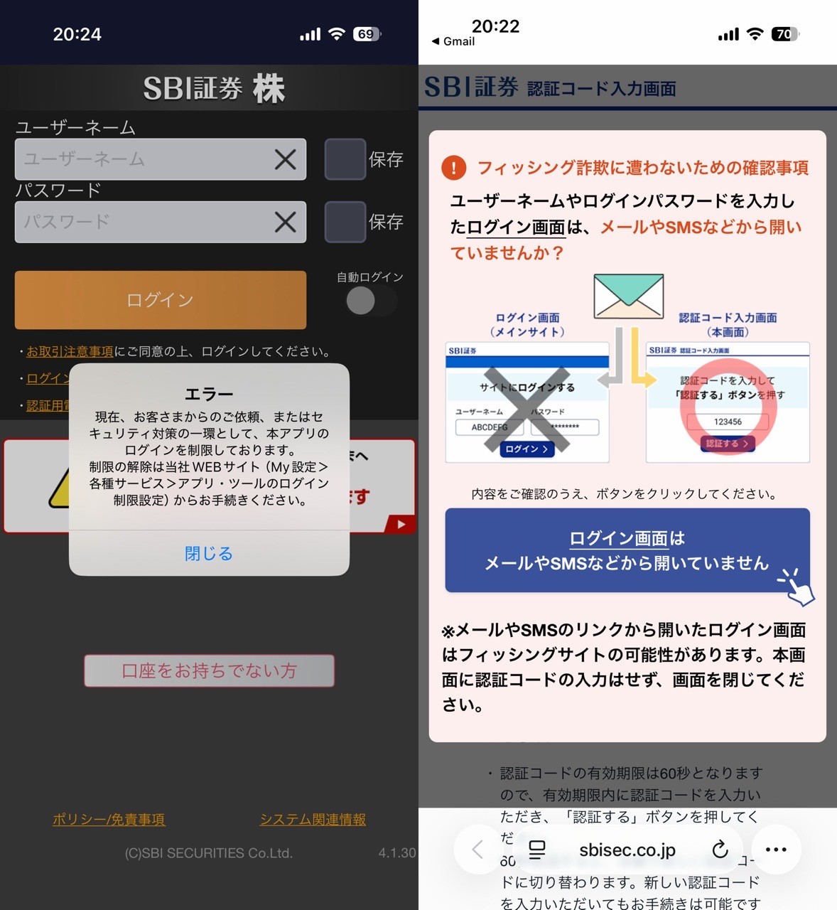 SBI証券のアプリのログインはとても苦労した(;・∀・) 何をどうすれば良いのかわかりにくいし、SBI証券から来たメールに載ってるURLを踏んだら言葉遊びみたいなダイアログ出すし、ログイン方法の説明が長ったらしくてわかりにくいのにログイン時間制限がきびしいし。https://mastodon-japan.net/@nilab/115326994512961751