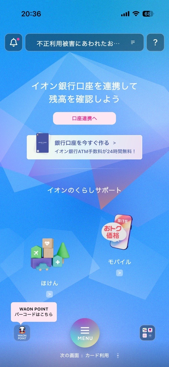 ひさびさにイオンウォレットのアプリを起動したけど、スワイプしたら何が起きるかわからないような相変わらずひどいUIのままだった (小さい文字で「次の画面: 〇〇」って書いてあるけどこんなの見落とすよ)