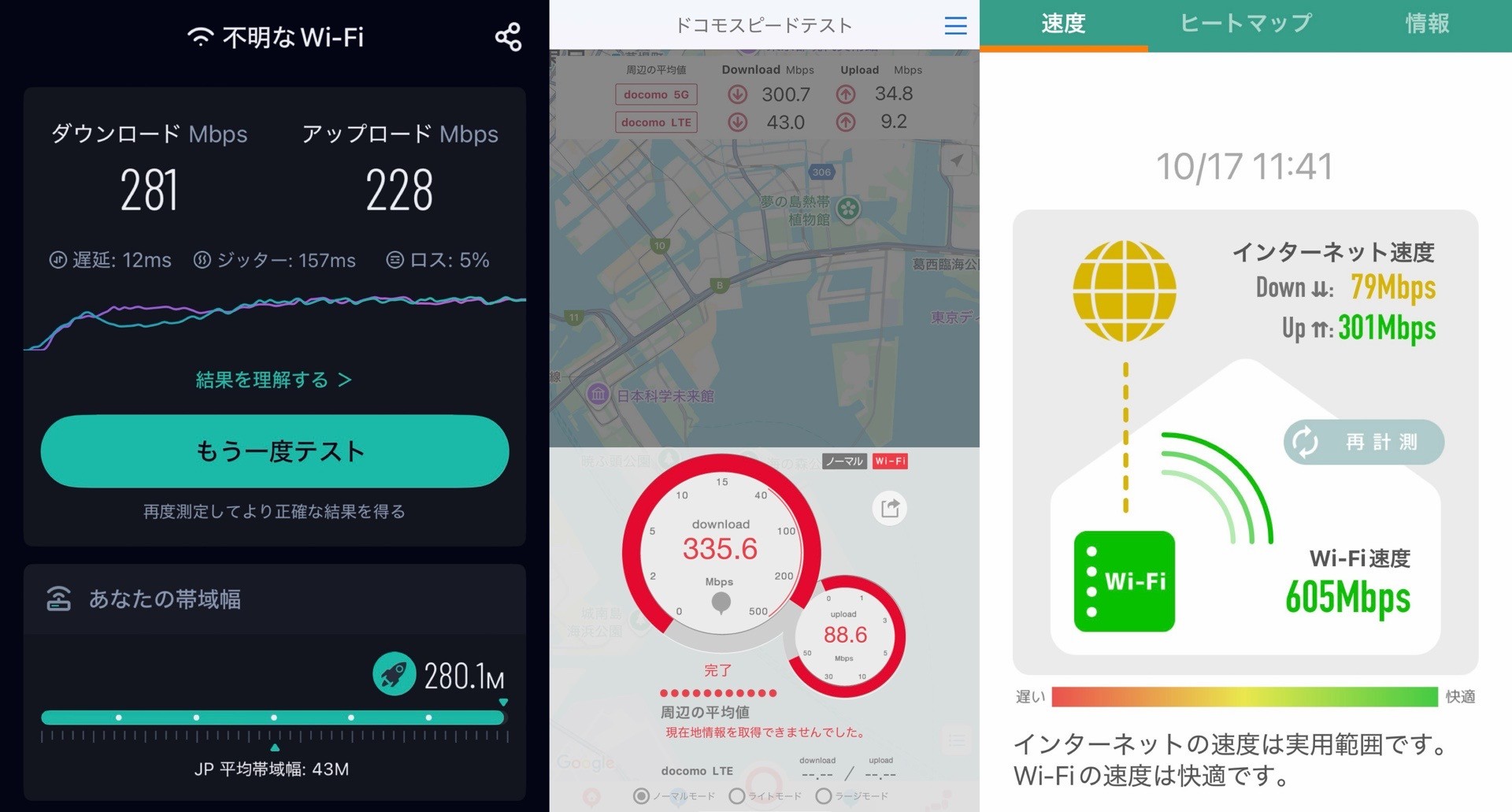 通信回線速度をいくつかのアプリで計測してみた。最大で300Mbpsぐらい出ていると思っていいんだろうか。