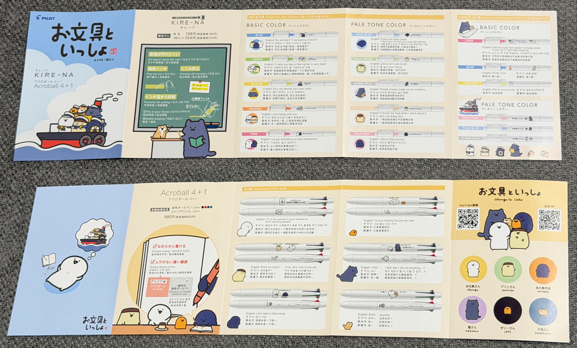 > PILOT お文具といっしょコラボデザイン。> 「お文具といっしょ」限定描き下ろしイラストで、パイロットの蛍光ペン「KIRE-NA (キレーナ)」と多機能筆記具「Acroball (アクロボール) 4+1」とコラボデザイン商品。> 近所のイオンではけっこう売れていてすでにない種類もあったし数量限定商品なので、転売がちょっと心配。