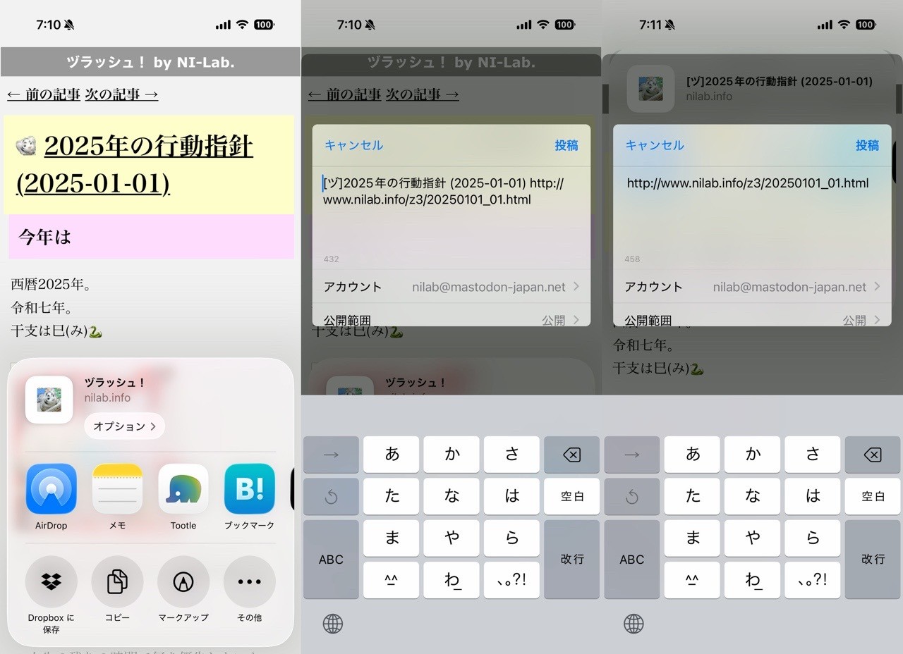 いま見ているWebページのタイトルとURLをSNSに投稿したい。 iPhone 共有機能を比較する。 iPhone Safari から Tootle には、タイトルとURLを送ることができる。 iPhone Chrome から Tootle には、URLだけを送ることができる。 iPhone Safari から Twitter には、タイトルとURLを送ることができる。 iPhone Safari から Threads や Bluesky には、URLだけを送ることができる。 自分が iPhone を使うときは、タイトルとURLを送ってくれる Safari + Tootle (Mastodon) が最強。