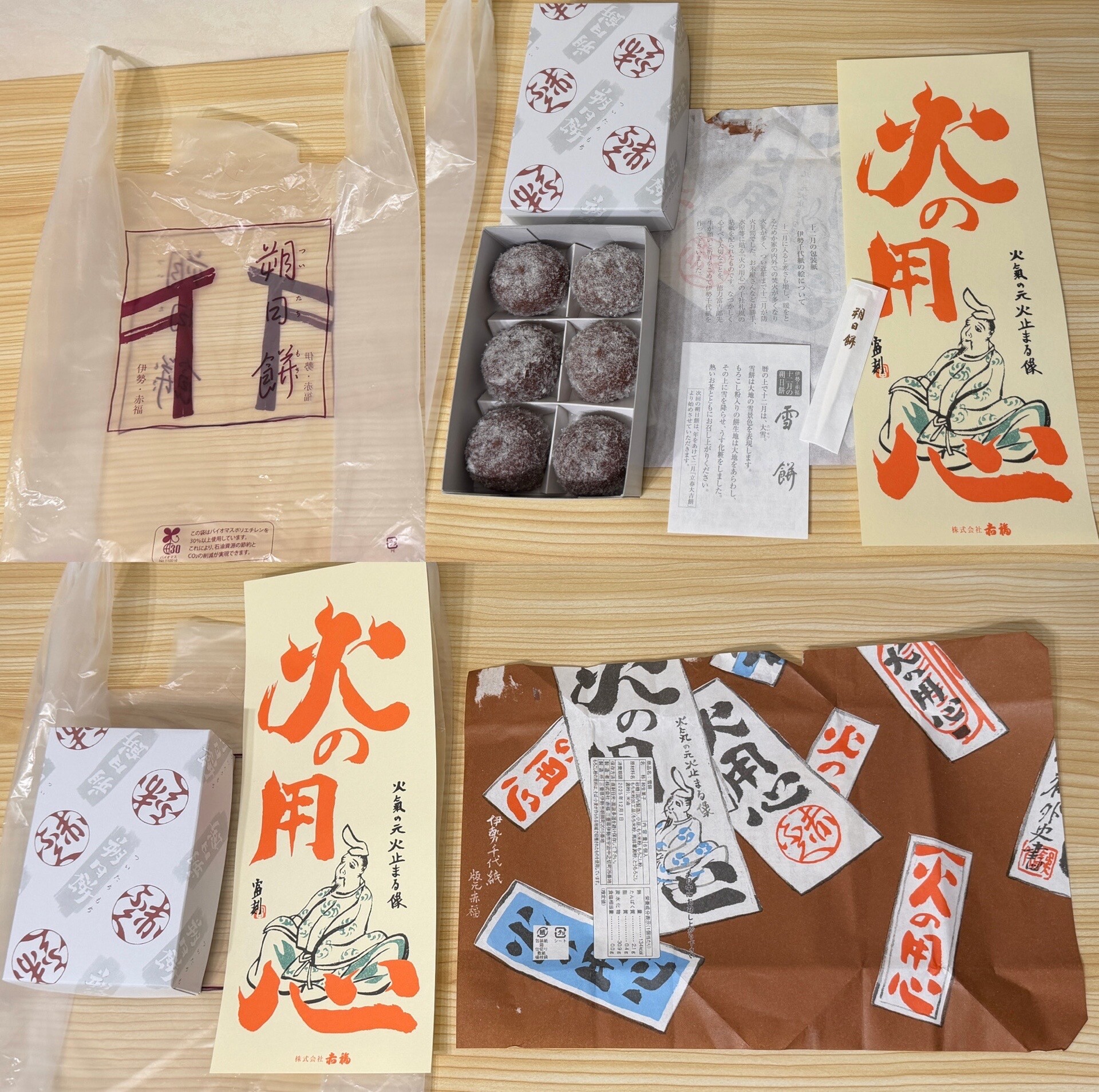 赤福 朔日餅 十二月 雪餅。中は赤福の漉し餡ぽい。「火の用心」千社札風の貼紙付き。