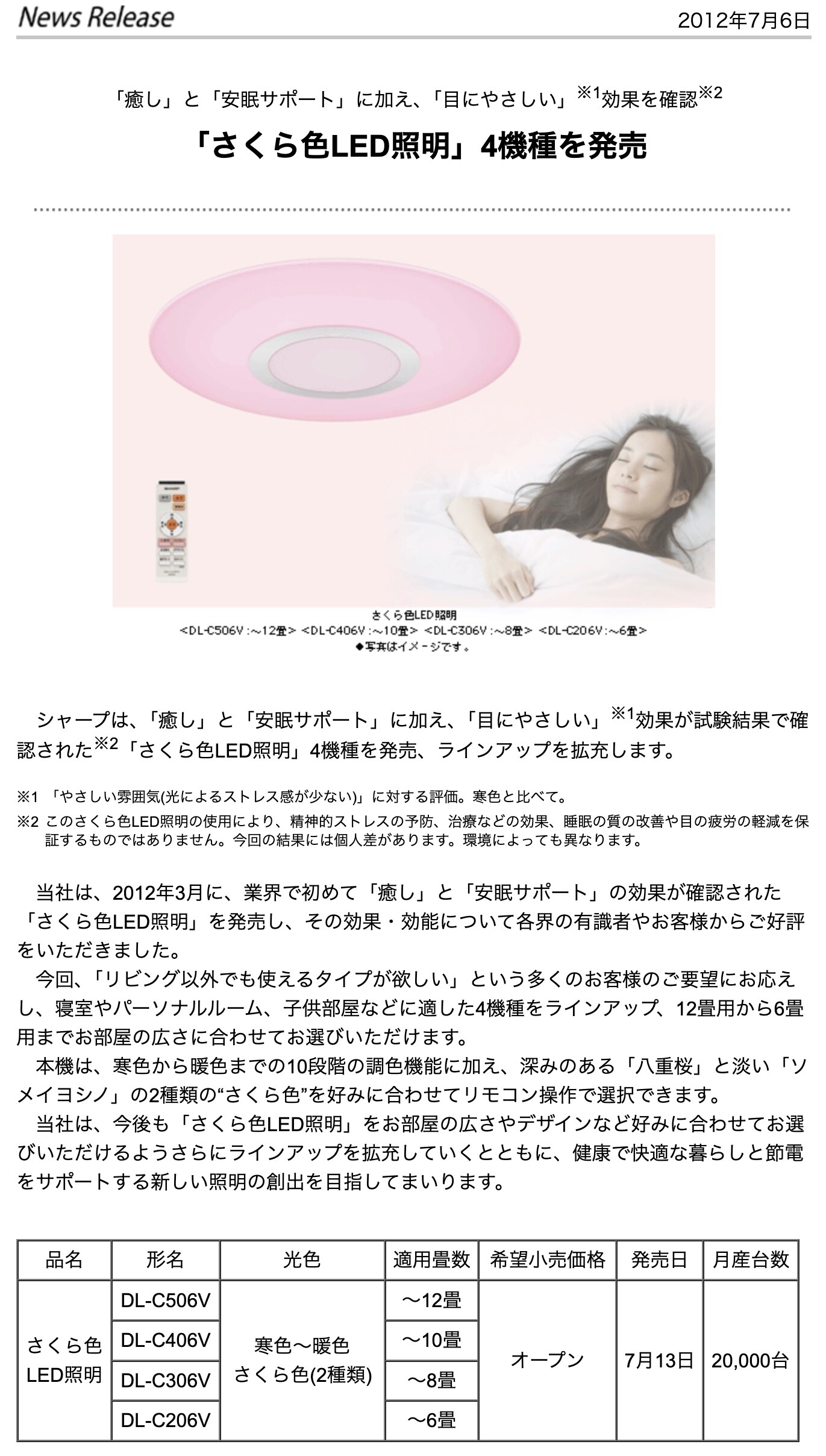 「さくら色LED照明」4機種を発売 | ニュースリリース:シャープ https://corporate.jp.sharp/news/120706-a.html