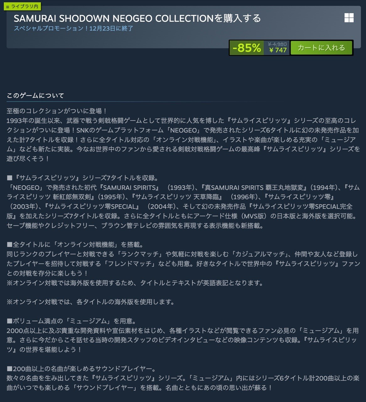 サムライスピリッツ ネオジオコレクション (SAMURAI SHODOWN NEOGEO COLLECTION) を85%オフの747円で購入。