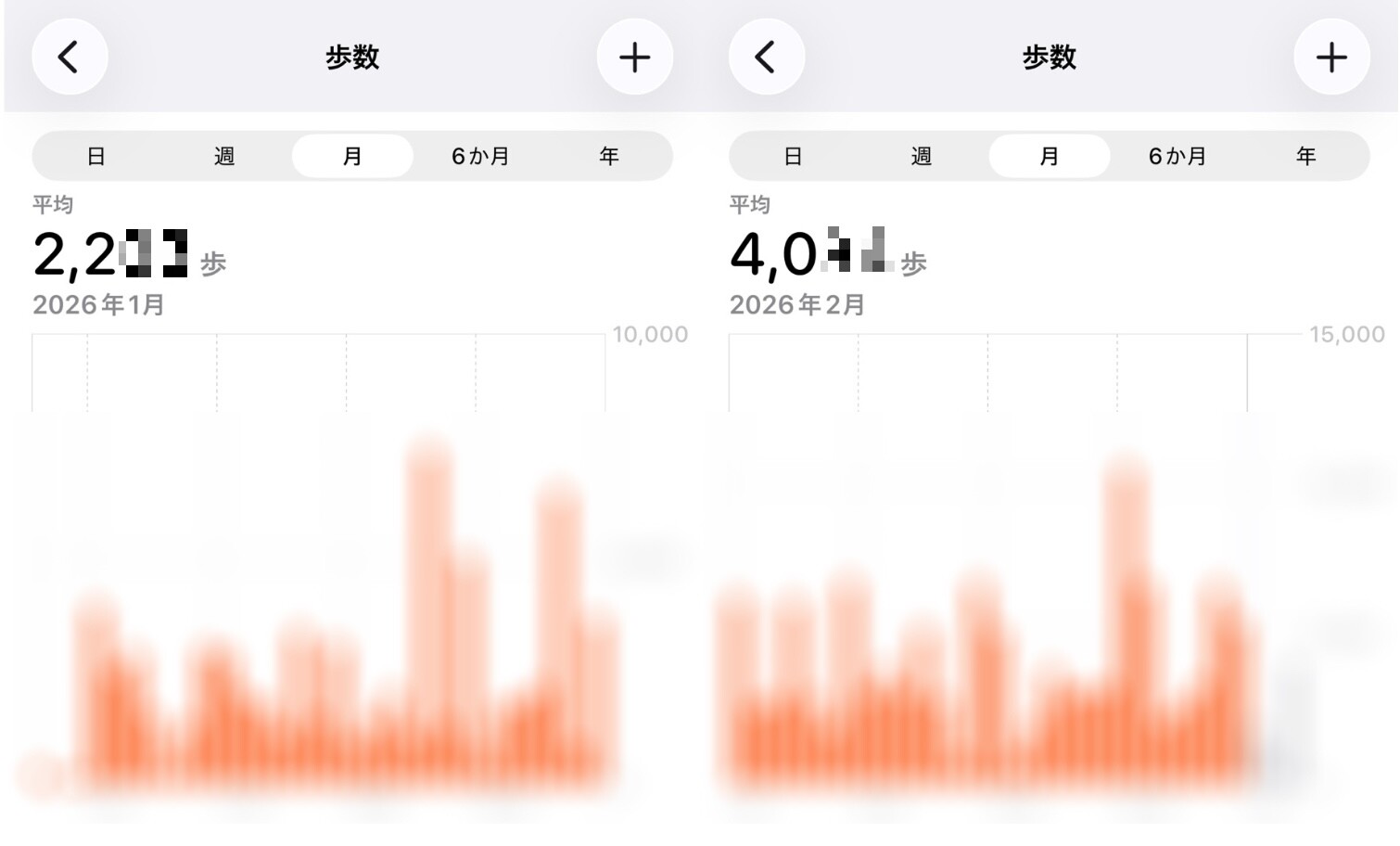 1日の平均歩数。働いていた1月は約2200歩。無職で過ごした2月は約4000歩。ちょっとは健康的な生活になってきた? ( ´∀`)