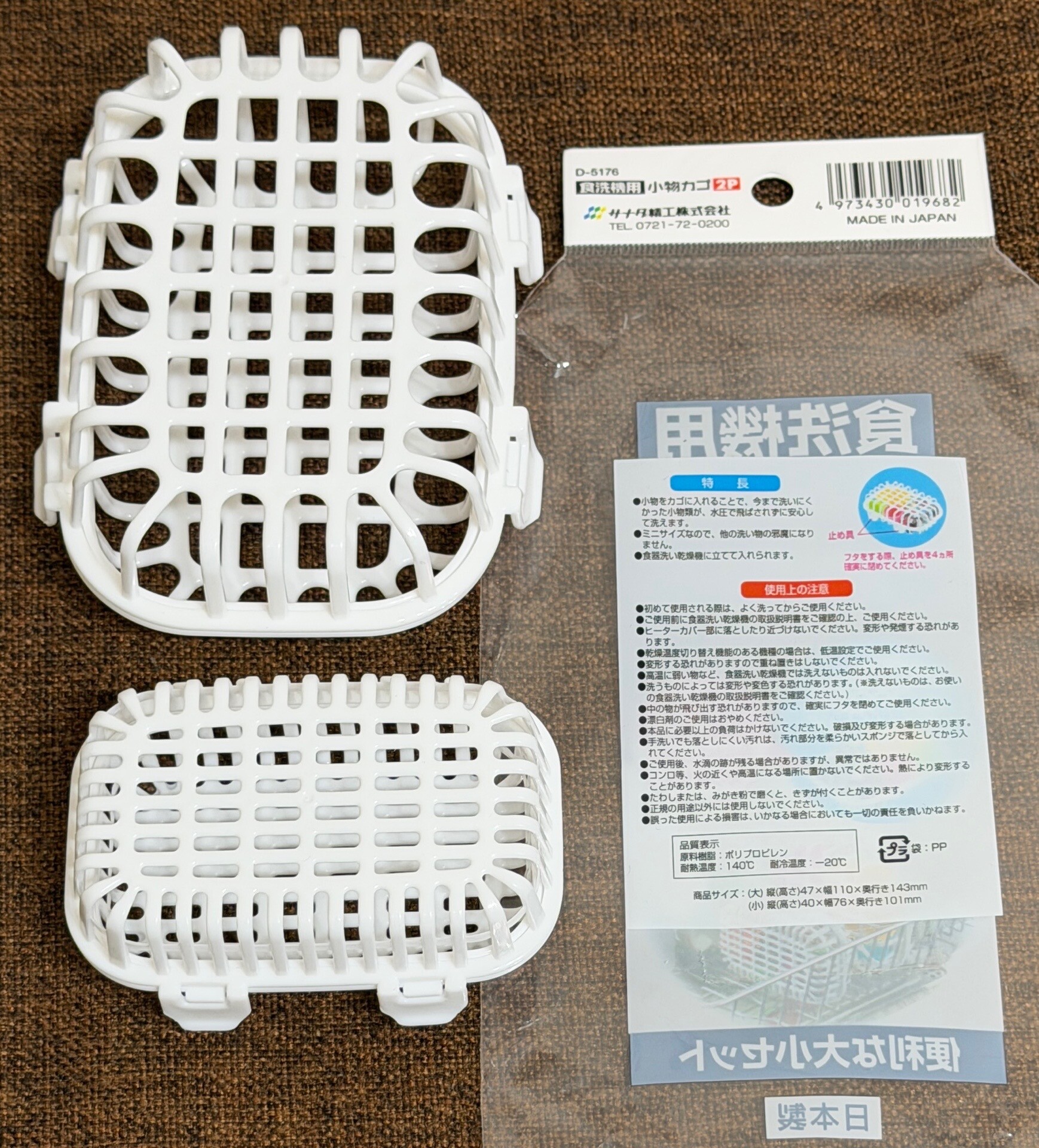 食洗機用小物カゴWって書いてあるけど、サナダ精工 食洗機用小物カゴ2P D5176の写真が載っている。データを間違えているんじゃないかな・・・ 「小物をひとまとめ。 大小2個セット! 食洗機の中で小物がバラバラになりません。」 「●カートン入数:100入 (10×10)」 「●商品サイズ(個装サイズ):110×255×100Hmm」 「●カートンサイズ:440×580×480Hmm」 「●カートン重量:7.1kg」 「●材質:ポリプロピレン」 「●参考上代:\240」 「●日本製」 食洗機用小物カゴ W - (キッチン|シンク用品):サナダ精工株式会社 https://www.sanadaseiko.co.jp/products/index.php/item?cell003=キッチン&cell004=シンク用品&label=1&name=食洗機用小物カゴ W&id=165