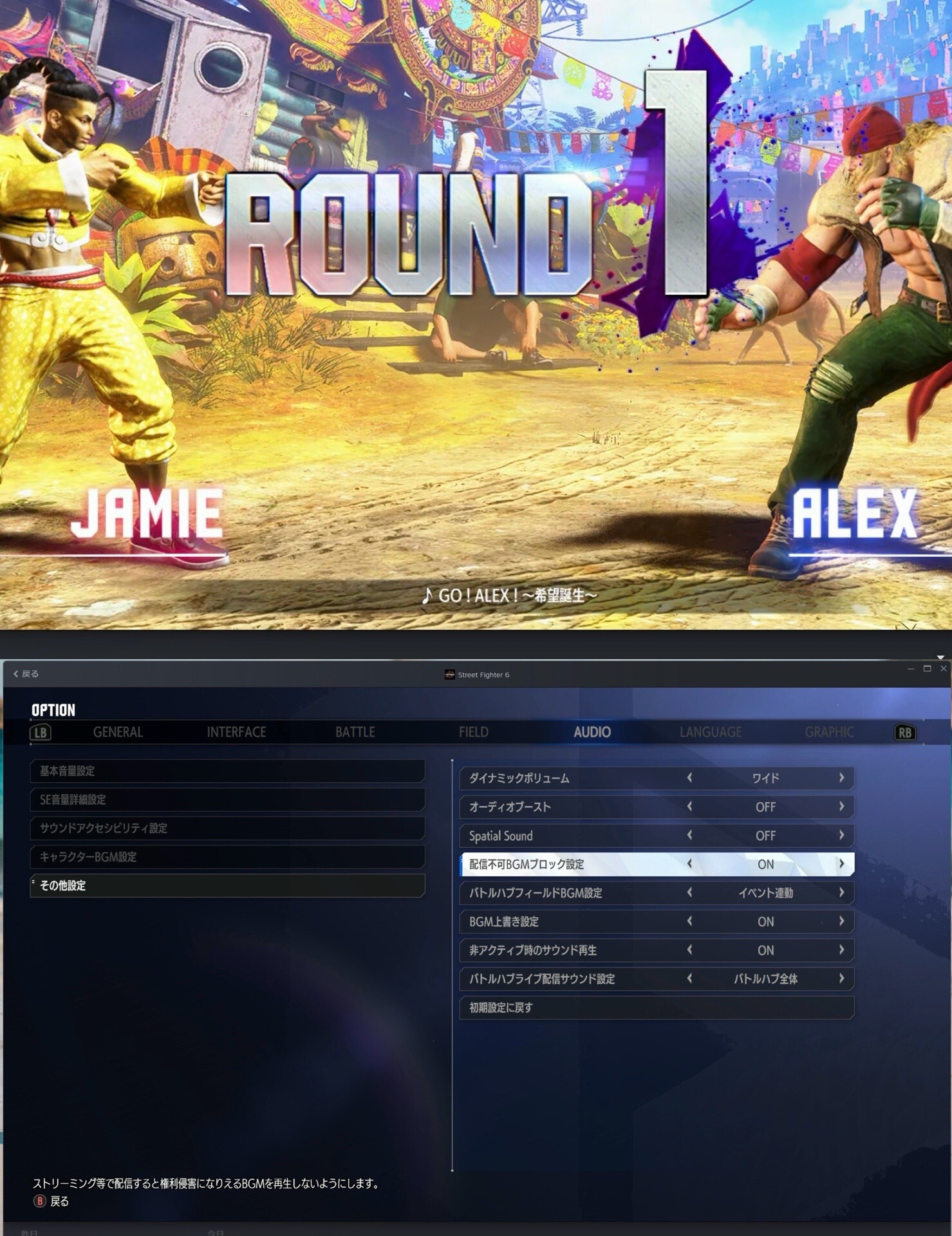 ストリートファイター6。オプションの「配信不可BGMブロック設定」をONにしてみたけど、「GO!ALEX!~希望誕生~」が流れた。もしかして配信OKな曲ということなのだろうか( ´∀`) #スト6 #アレックス