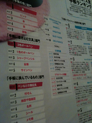 『働く女性1200人の、人気手帳ランキング』ほぼ日手帳と能率手帳が強い。色は黒、ピンク、赤が人気高い。 - 日経 WOMAN (ウーマン) 2009年 12月号 [雑誌] / 日経WOMAN http://mono.hatena.ne.jp/mono/wtvts6S53H#/nilab/wtnvkoSWce