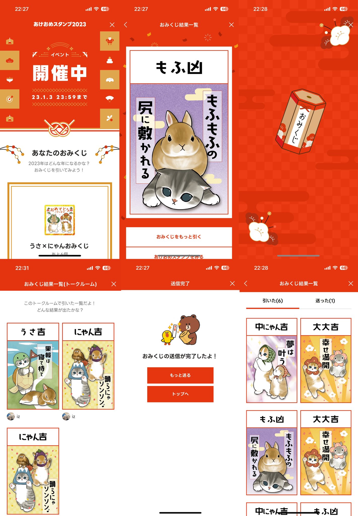 LINEあけおめスタンプ2023おみくじ引く。もふもふの尻に敷かれる🐰🐱