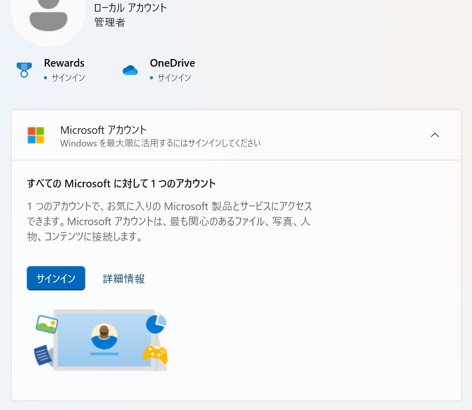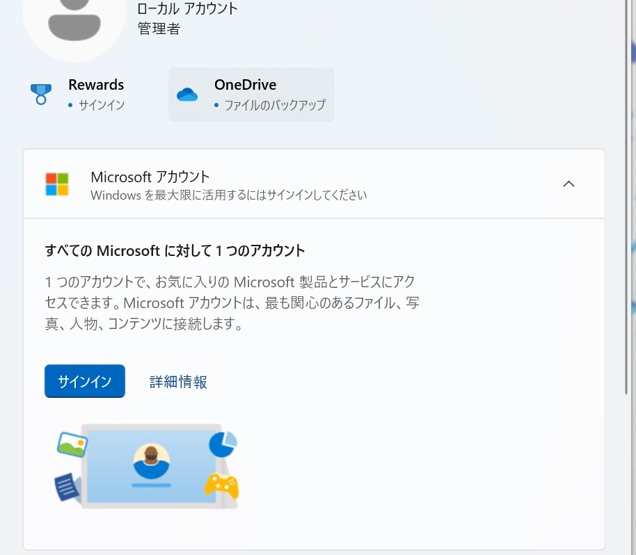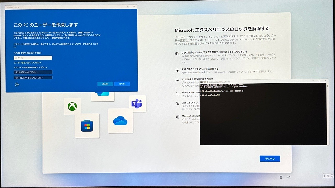 Windows 11 セットアップ中は Microsoft アカウントのサインインを回避したい。「Microsoft エクスペリエンスのロックを解除する」画面にて、ShiftキーとF10キーを押してコマンドプロントを表示し、start ms-cxh:localonly を入力して、PCローカルユーザーアカウントを作成する。ローカルアカウントは秘密の質問とその回答を3つ設定する必要がある。