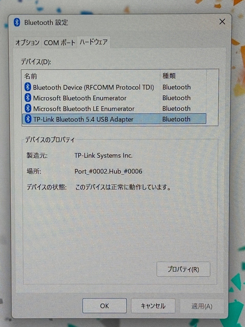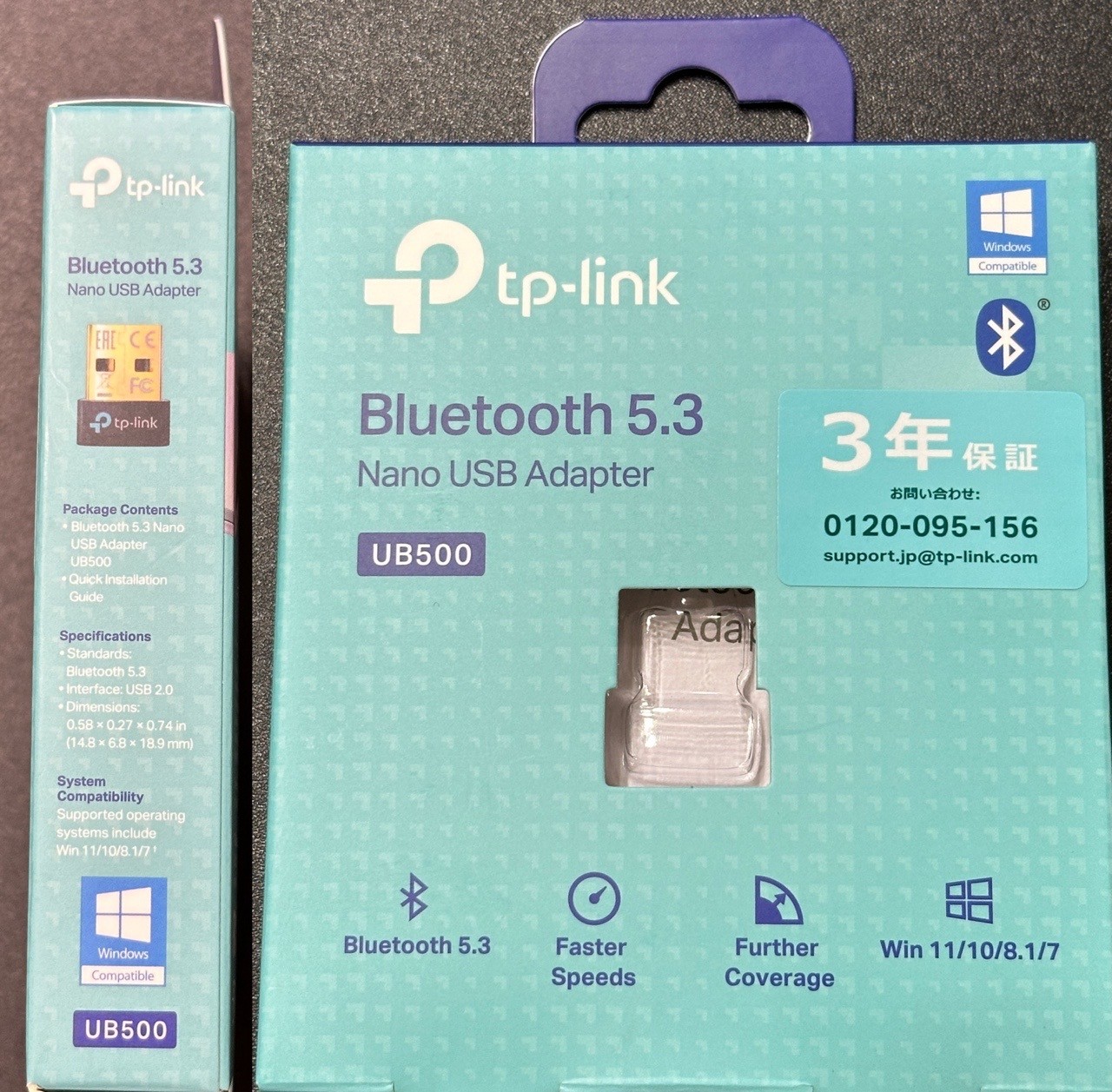iiyama PC LEVEL-M1P5-R45-RK4X レッド/ブラックに、TP-Link Bluetooth 5.3 Nano USB Adapter UB500 を接続。特に何もしなくても Bluetooth 5.4 に対応してくれているように見える (明示的なドライバインストールとかはしていない)。
