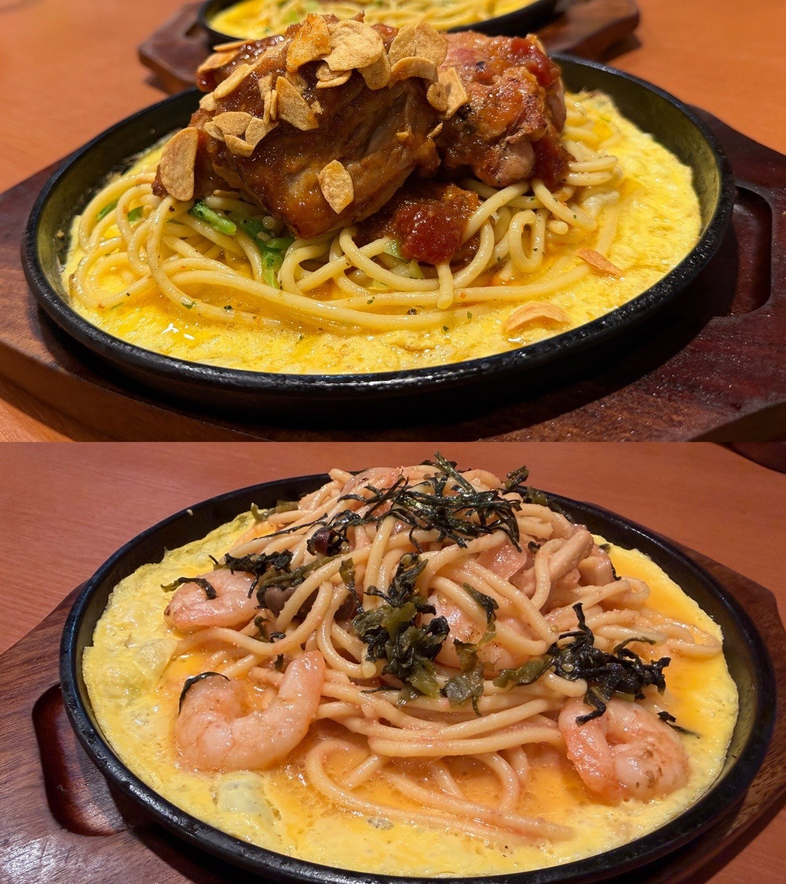 パスタ・デ・ココ 期間限定 肉塊ペペロンチーノ(肉マシ 約1.5倍) & 鉄板エビと明太子の和風スパゲッティ