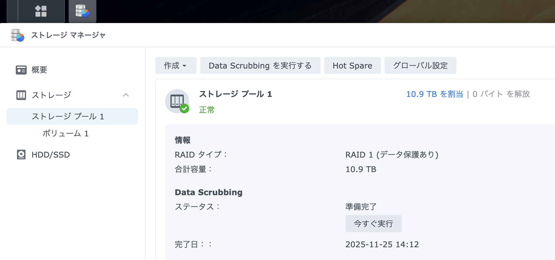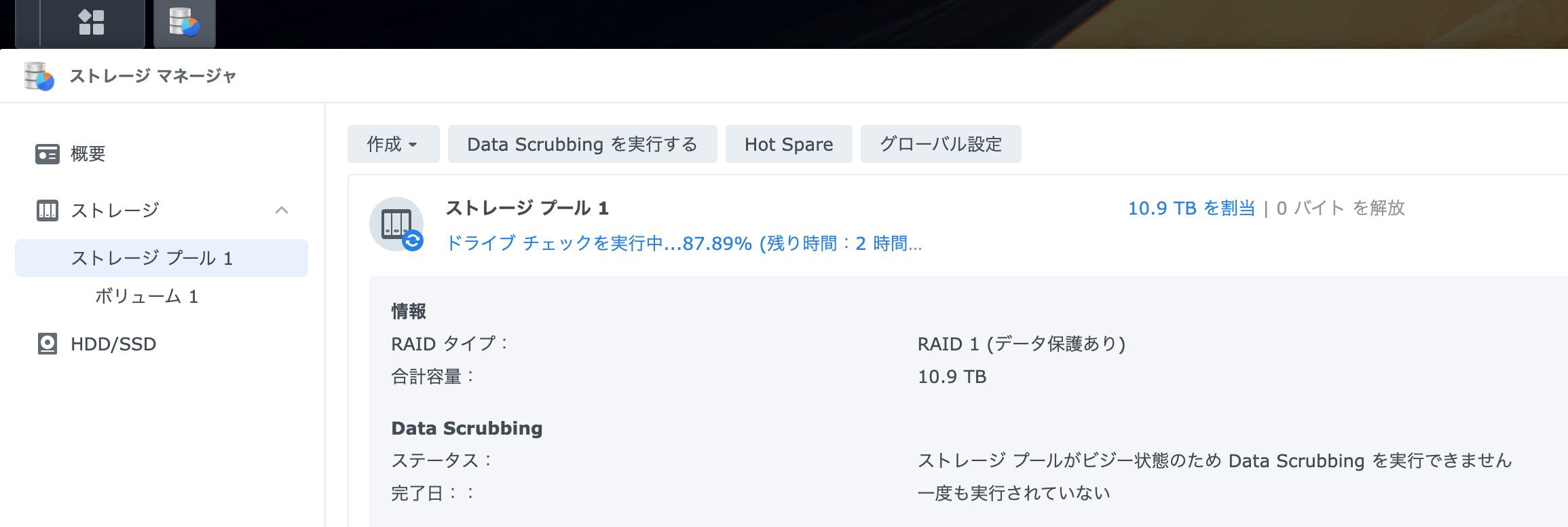 Data Scrubbing | DSM - Synology ナレッジセンター https://kb.synology.com/ja-jp/DSM/help/DSM/StorageManager/storage_pool_data_scrubbing?version=7
