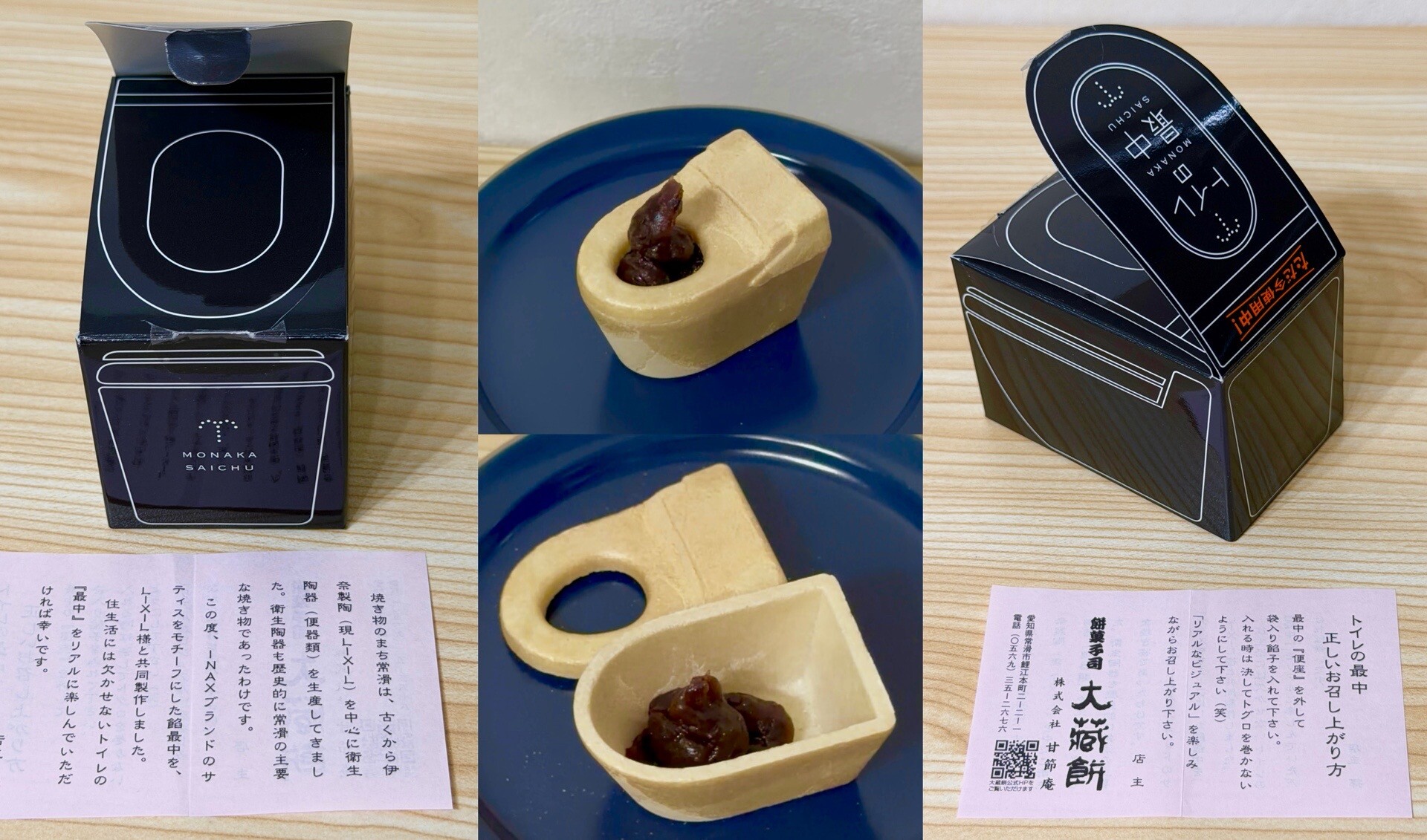 「LIXIL 榎戸工場と常滑の老舗和菓子店・大蔵餅様とのコラボレーションによる和菓子! トイレのかたちをした「もなか」菓子です。ご自身で、トイレ形状のもなか皮に餡子を詰めてお楽しみください。 ※入れるときは決してトグロを巻かないようにご注意ください。やきものの街・常滑のユニークなお土産としてもおすすめな、おいしい逸品です。」 トイレの最中|ピックアップ|ミュージアムショップ|INAXライブミュージアム https://livingculture.lixil.com/ilm/shop/pickup/monaka/