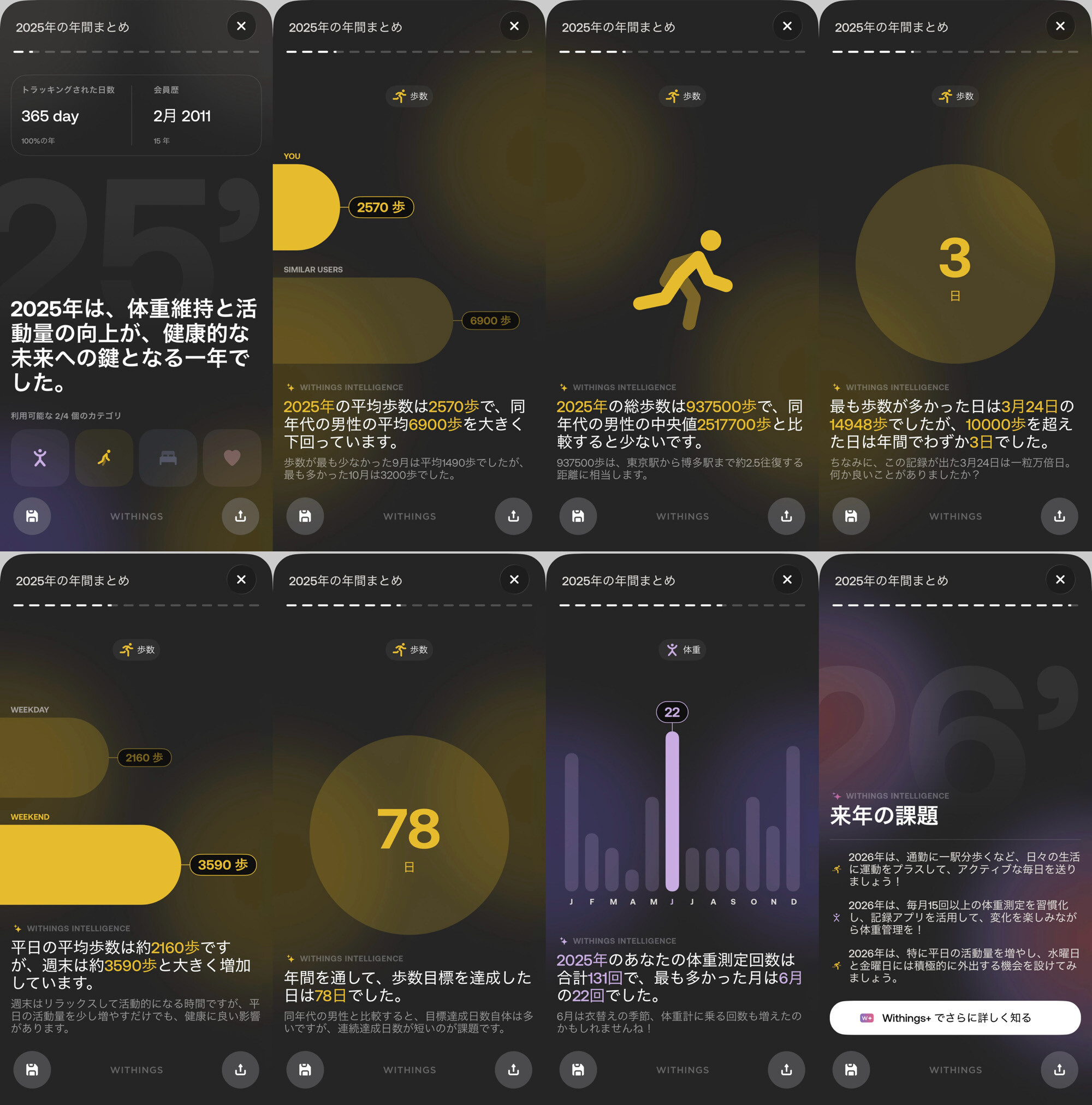 Withings 2025年の健康サマリー、パソコンからWebサイト上では見れないんだなぁ。アプリでしか見れないのかも。