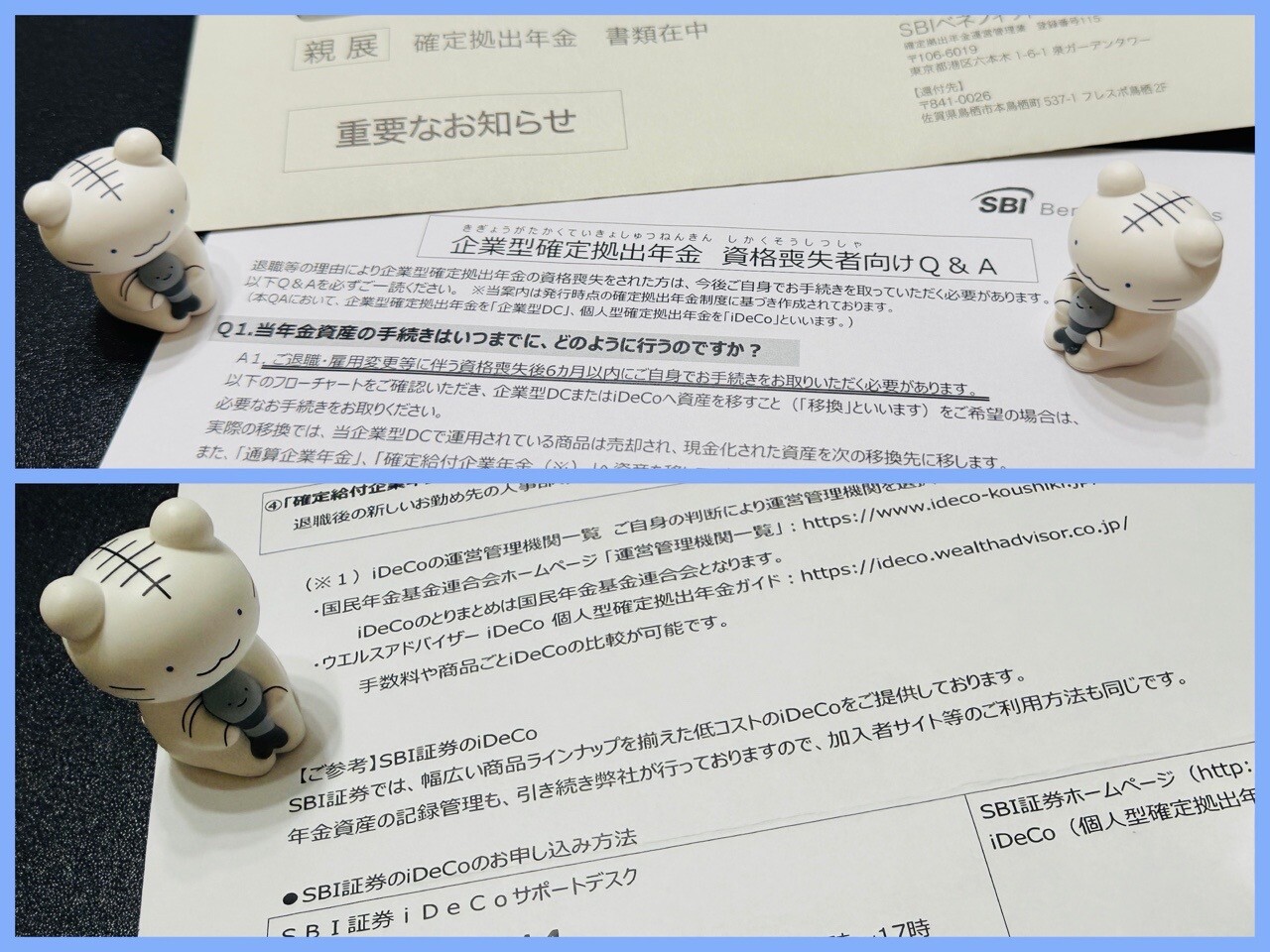 企業型確定拠出年金(企業型DC)の加入者資格喪失のお知らせが届いた。移換先のiDeCoとして、SBIベネフィット・システムズと同じグループのSBI証券が紹介されている。