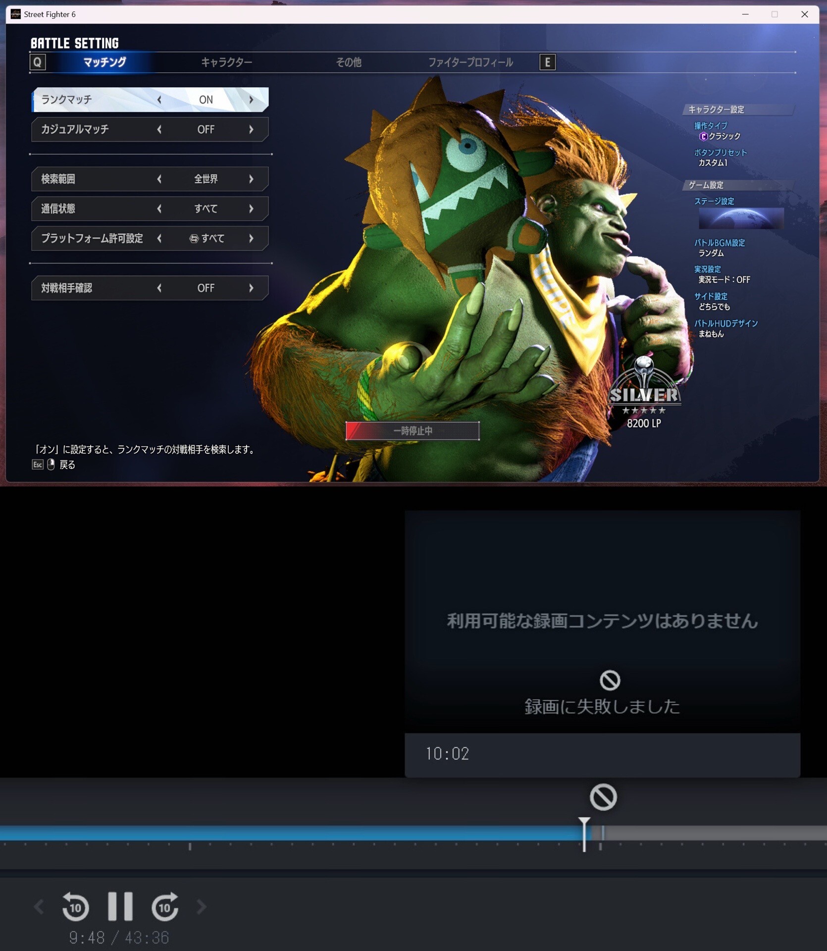スト6、ブランカで認定マッチして10戦目の最後にCAでフィニッシュしたのにSteam録画に失敗してた(ノД`) それにしても必殺技の使い方もいまいちわからずにやったわりにはシルバー星5になってて嬉しいやら困ったやら。