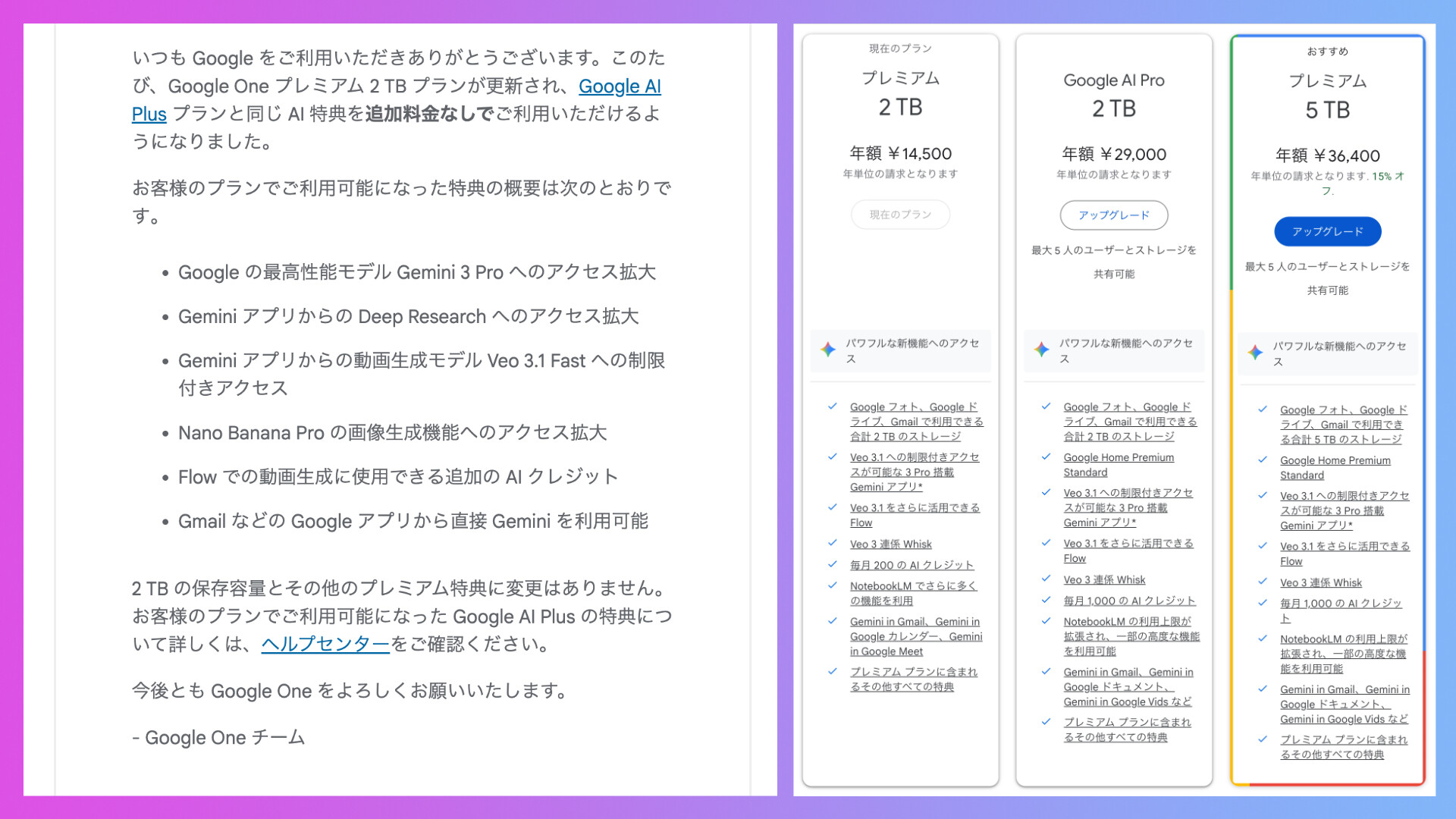 Google One プレミアム 2TB プランなのに、いつのまにか動画生成できるようになってるなーって思ったら(;´∀`) Google AI Plus はストレージ量が少なめでお安いプランらしい。こういう機能と価格のプラン改定がちょくちょく起きるんだろうなぁ。 「このたび、Google One プレミアム 2 TB プランが更新され、Google AI Plus プランと同じ AI 特典を追加料金なしでご利用いただけるようになりました」 「Gemini アプリからの動画生成モデル Veo 3.1 Fast への制限付きアクセス」 「Nano Banana Pro の画像生成機能へのアクセス拡大」 「Flow での動画生成に使用できる追加の AI クレジット」