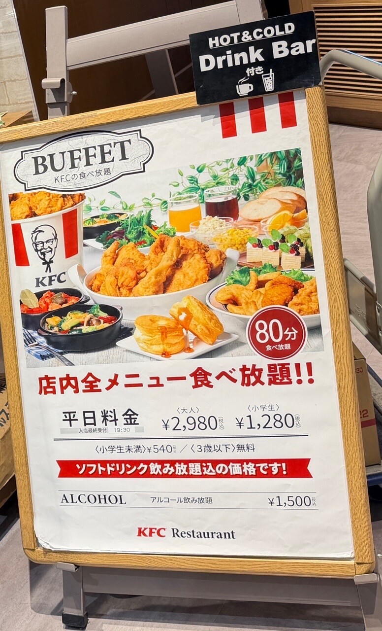 ケンタッキーフライドチキン ららぽーと名古屋みなとアクルス店 食べ放題ビュッフェ。料理とデザートはひと通り全部食べたと思う。オリジナルチキンの部位は2種類だけにした。もも肉おいしい。
