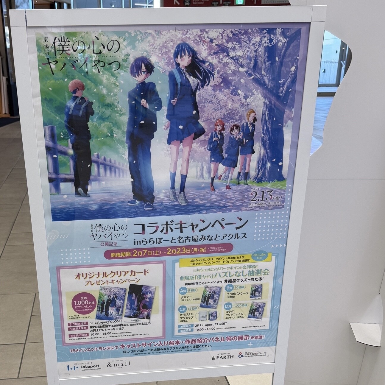 「劇場版「僕の心のヤバイやつ」の2/13(金)の公開を記念し、三井ショッピングパーク ららぽーと名古屋みなとアクルスにて、2/7(土)~2/23(月・祝)の期間でコラボキャンペーンの実施が決定しました。 非売品のコラボグッズが当たる抽選会や貴重な原画を展示する映画公開記念パネル展などを実施いたします。 」 劇場版「僕の心のヤバイやつ」公開記念 コラボキャンペーンinららぽーと名古屋みなとアクルス 実施決定!! | ららぽーと名古屋みなとアクルス https://mitsui-shopping-park.com/lalaport/minatoaquls/event/3288555.html