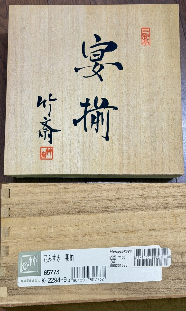 三洋陶器 竹斎 三彩亭 花みずき 宴揃 85773 K-2294-9。木箱の中には、大皿1つ、深皿1つ、小皿5つ。検索してみるとメルカリで2000円〜4000円ぐらいで出品されている。昭和レトロ的な扱い。たぶん誰かの結婚式の引き出物で10年以上前にいただいたものだと思う。昨日やっと開封して使いはじめた( ´∀`) 三洋陶器株式会社は岐阜県土岐市駄知町の会社で、2018年に廃業している。