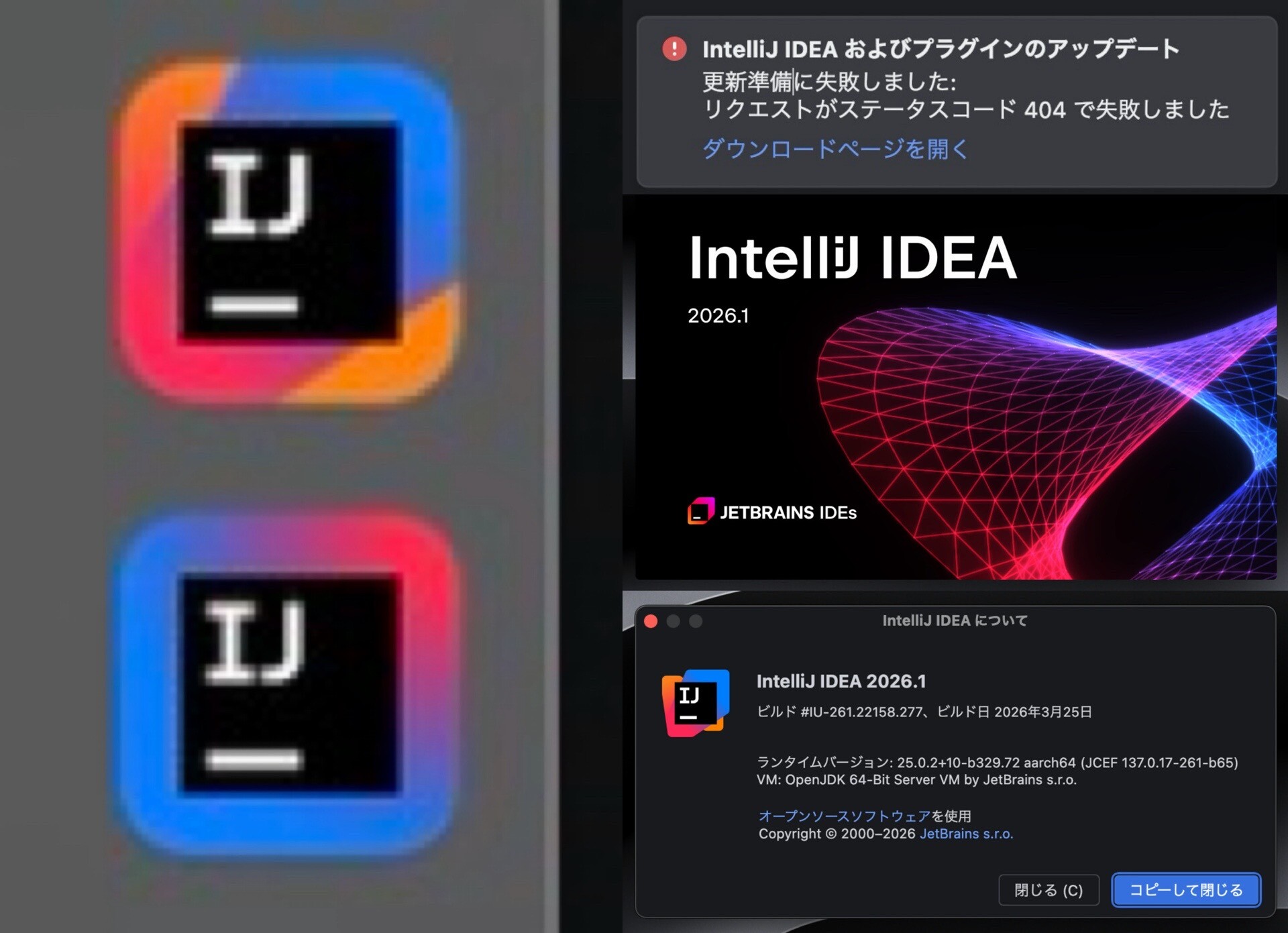 IntelliJ IDEA を数回アップデートしたところでなぜか404エラーになってしまう(;´∀`) 最新バージョンと思われる IntelliJ IDEA 2026.1 を新規インストールする。新バージョンは古いバージョンとアイコンが違う(上のアイコンが新バージョンのIntelliJ)。