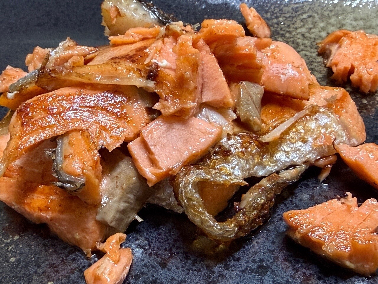 甘塩鮭を焼いたら砕けたけどまあ美味しい(*´∀`*)