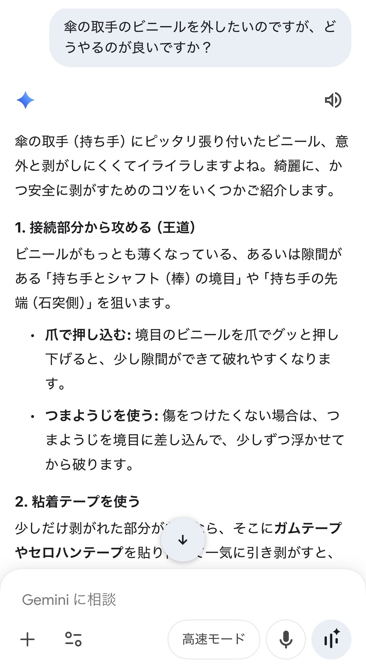 新品の傘の取手についているビニールをどうやって剥がすものかとGeminiに聞いたら爪楊枝とか。手近にピンセットがあったのでそれで剥がしたら楽に剥がせた。でもピンセットの尖った先をうっかり自分の指に突き刺してしまって声を上げるほど痛かった(ノД`)