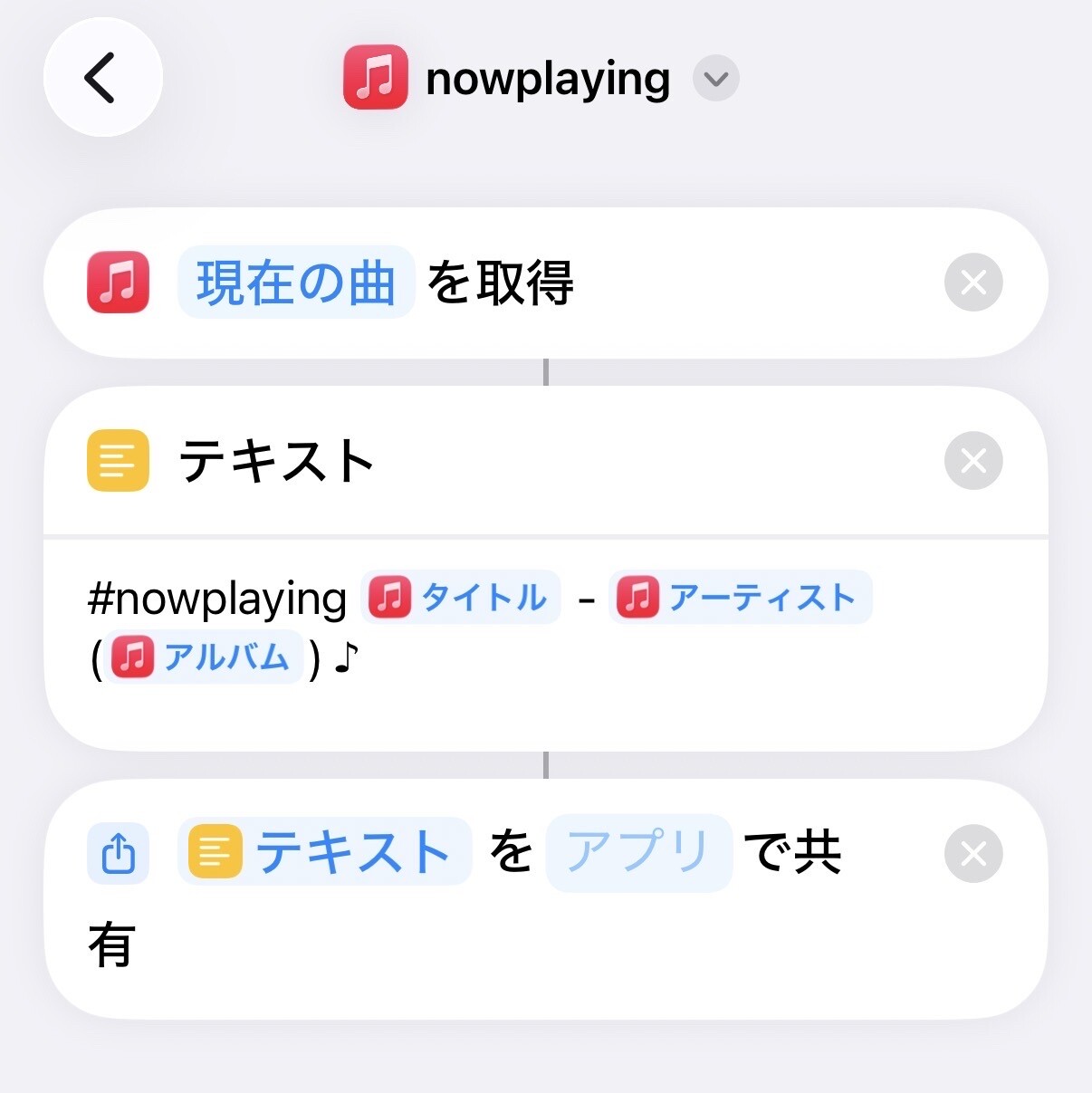 iPhone iOS のショートカット機能で #nowplaying 機能を作ってみた。テキストを作って好きなアプリにシェア機能でテキストを渡せる。アートワーク画像の投稿はできないけど。