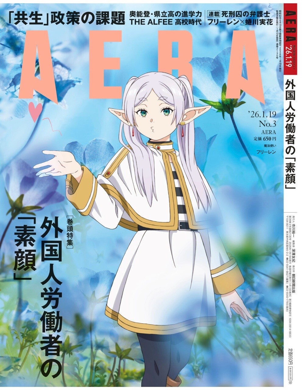 「1月13日(火)発売のAERA 2026年1月19日号の表紙には、TVアニメ『葬送のフリーレン』の主人公、フリーレンが登場します。AERA表紙フォトグラファーの蜷川実花とコラボした、AERAならではのスペシャルな表紙をお楽しみください。同作は、2023年に放送された第1期で世代や国境を超えて人気を拡大。今回AERAでは関連記事も掲載。過ぎた時間への後悔や何げない日常の大切さといったテーマがなぜ現代社会に響くのか、制作陣のインタビューを交えてその魅力に迫ります。巻頭特集は「外国人労働者の『素顔』」。円安・物価高でも日本を選ぶ理由や特定技能2号の恩恵、共生するための課題を、当事者や専門家への取材から解き明かします」「今号は月曜日が祝日のため発売日が通常とは異なり、1月13日(火)となります」