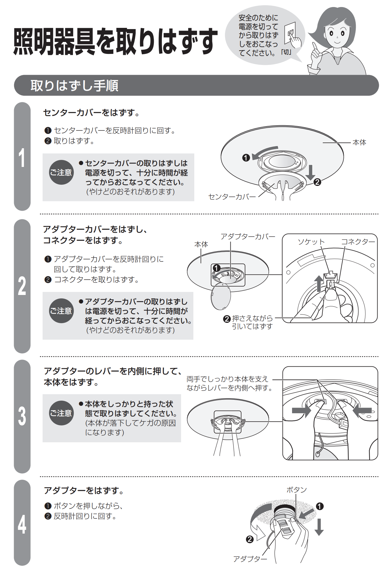 シャープ さくら色LEDシーリングライト DL-C406V の取り外し手順。説明書より。