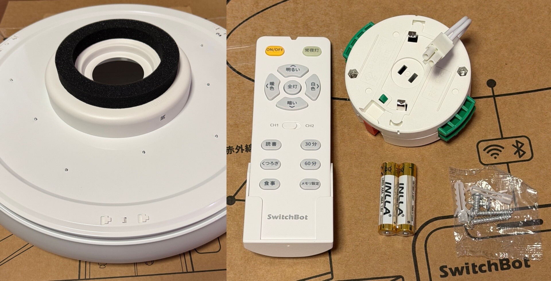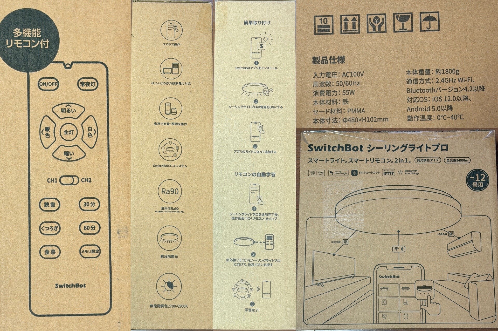 SwitchBot シーリングライトプロ 12畳 W2612250。本体、物理リモコン、アダプター。