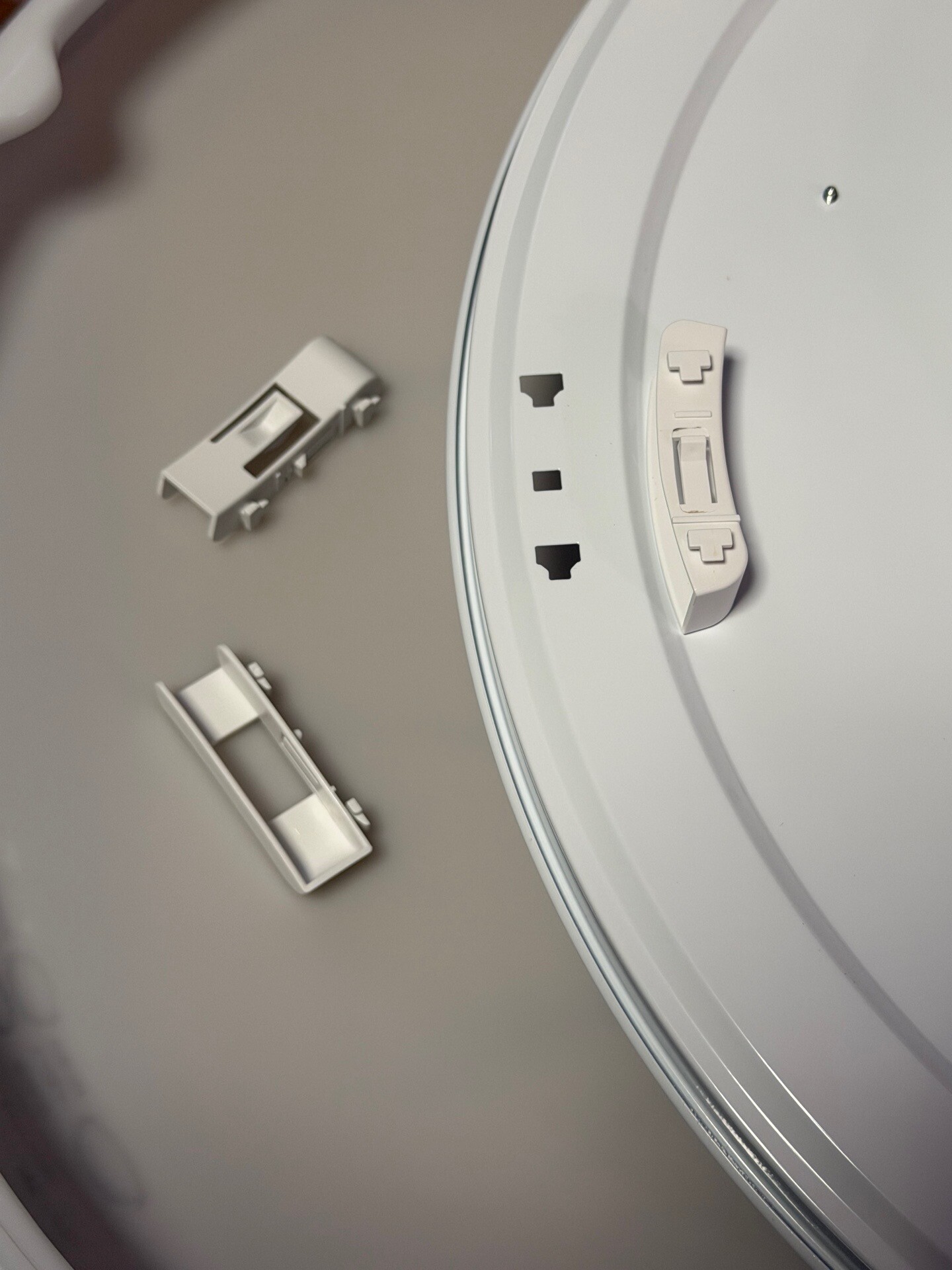 SwitchBot シーリングライトプロ 12畳 W2612250。本体中央の穴を掴んでセード(シェード, shade, カバー状のもの)を回せば外れると説明書に書いてあるけどぜんぜんダメ(;´∀`) 凸型で引っ掛けてあるパーツを先に外したらセードが外れるようになった。