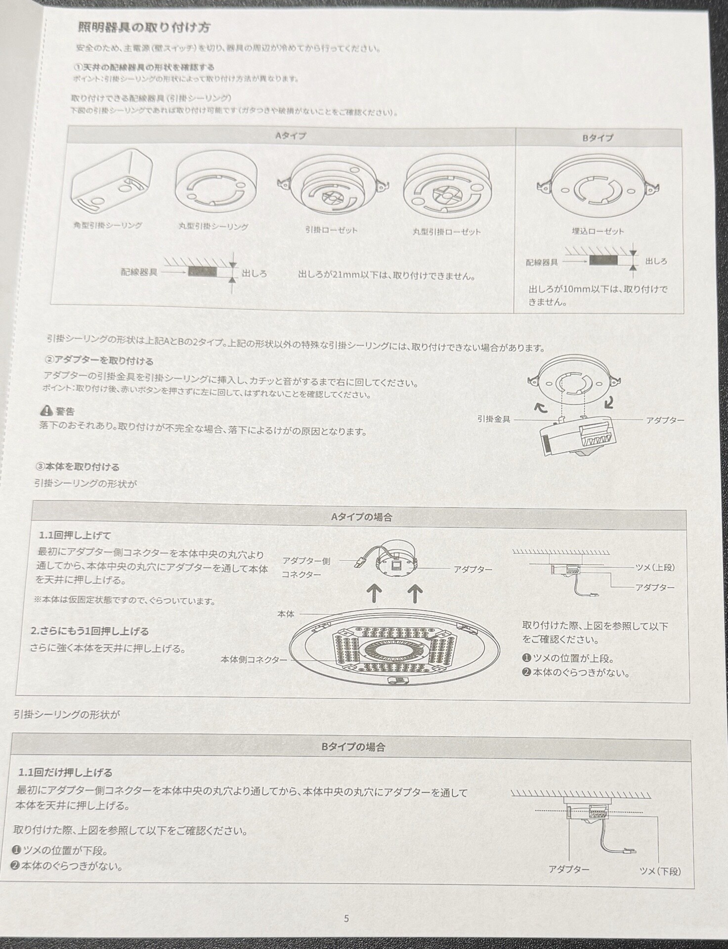 SwitchBot シーリングライトプロ 12畳 W2612250 取扱説明書。照明器具の取り付け方。アダプターを取り付けて、本体を天井に押し上げる。