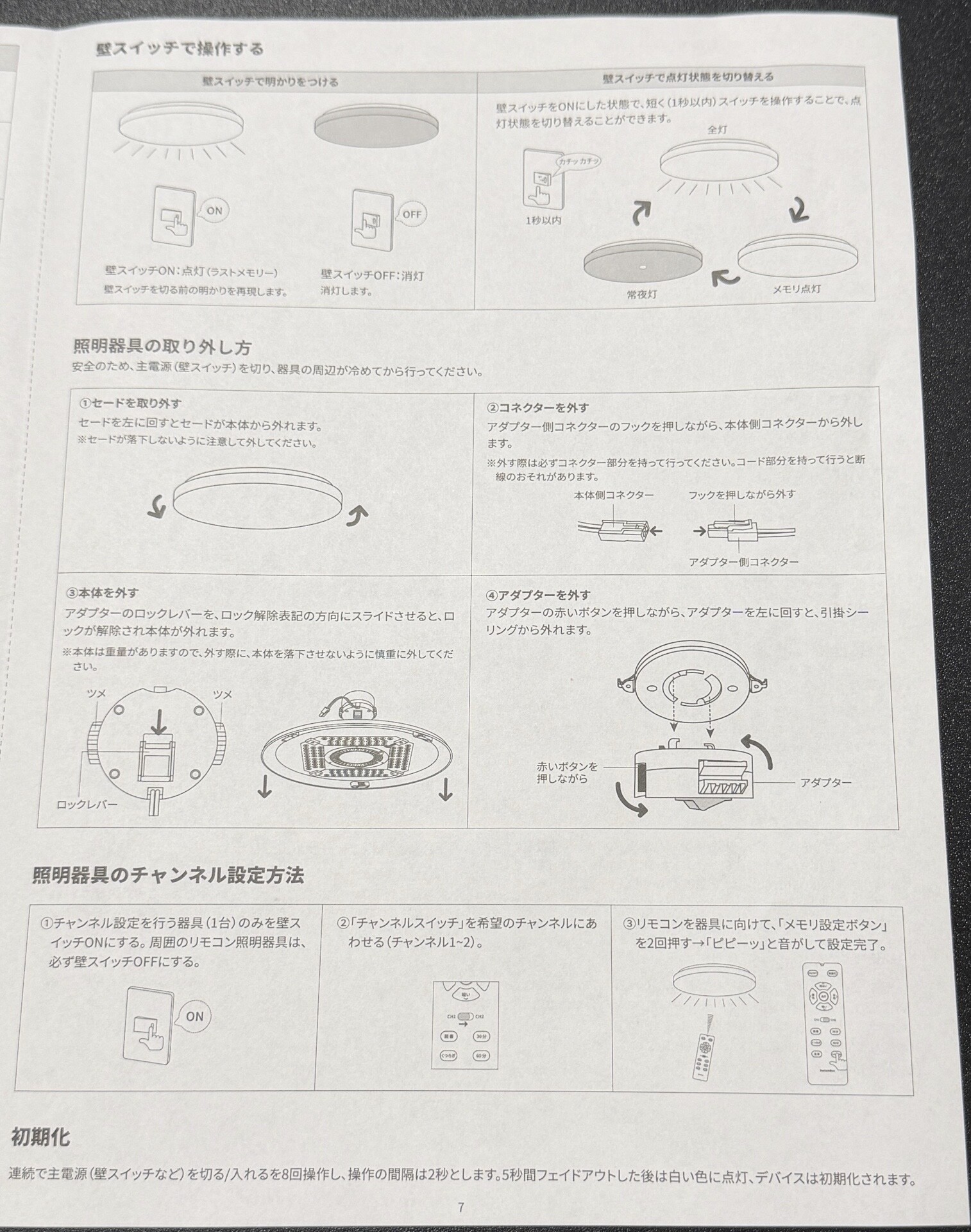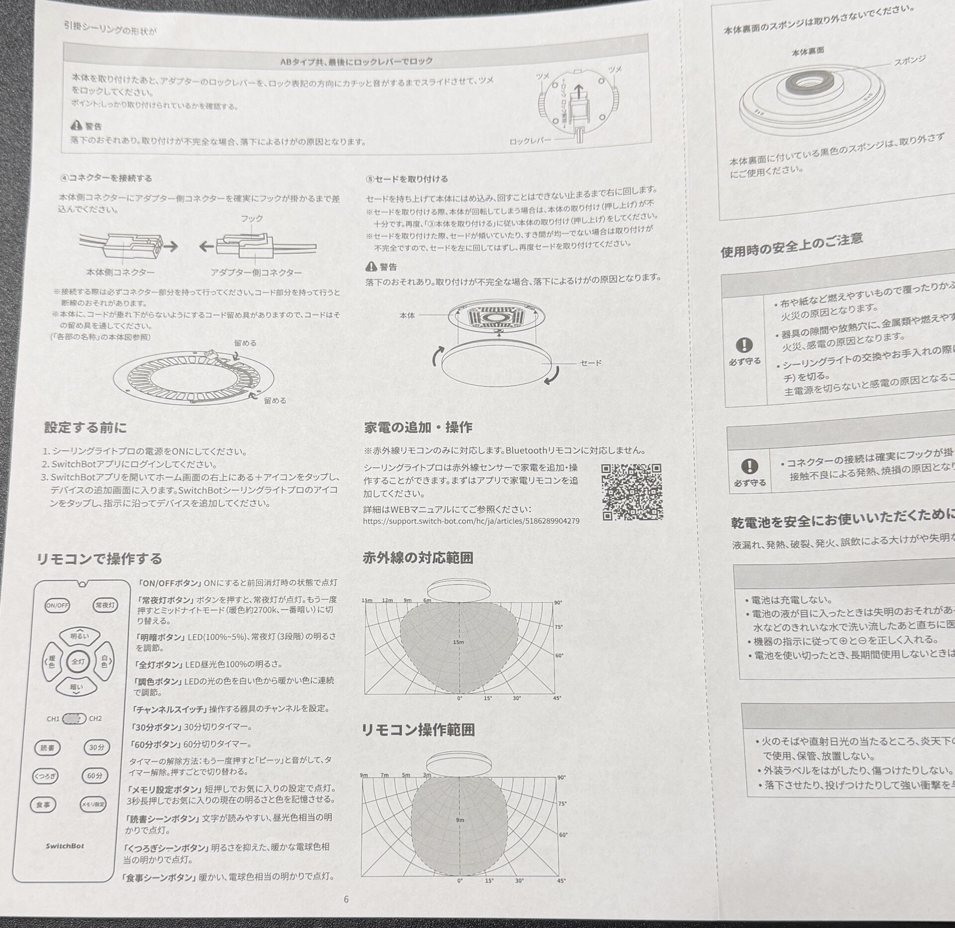 SwitchBot シーリングライトプロ 12畳 W2612250 取扱説明書。壁スイッチでの操作方法。照明器具の取り外し方。チャンネル設定方法。