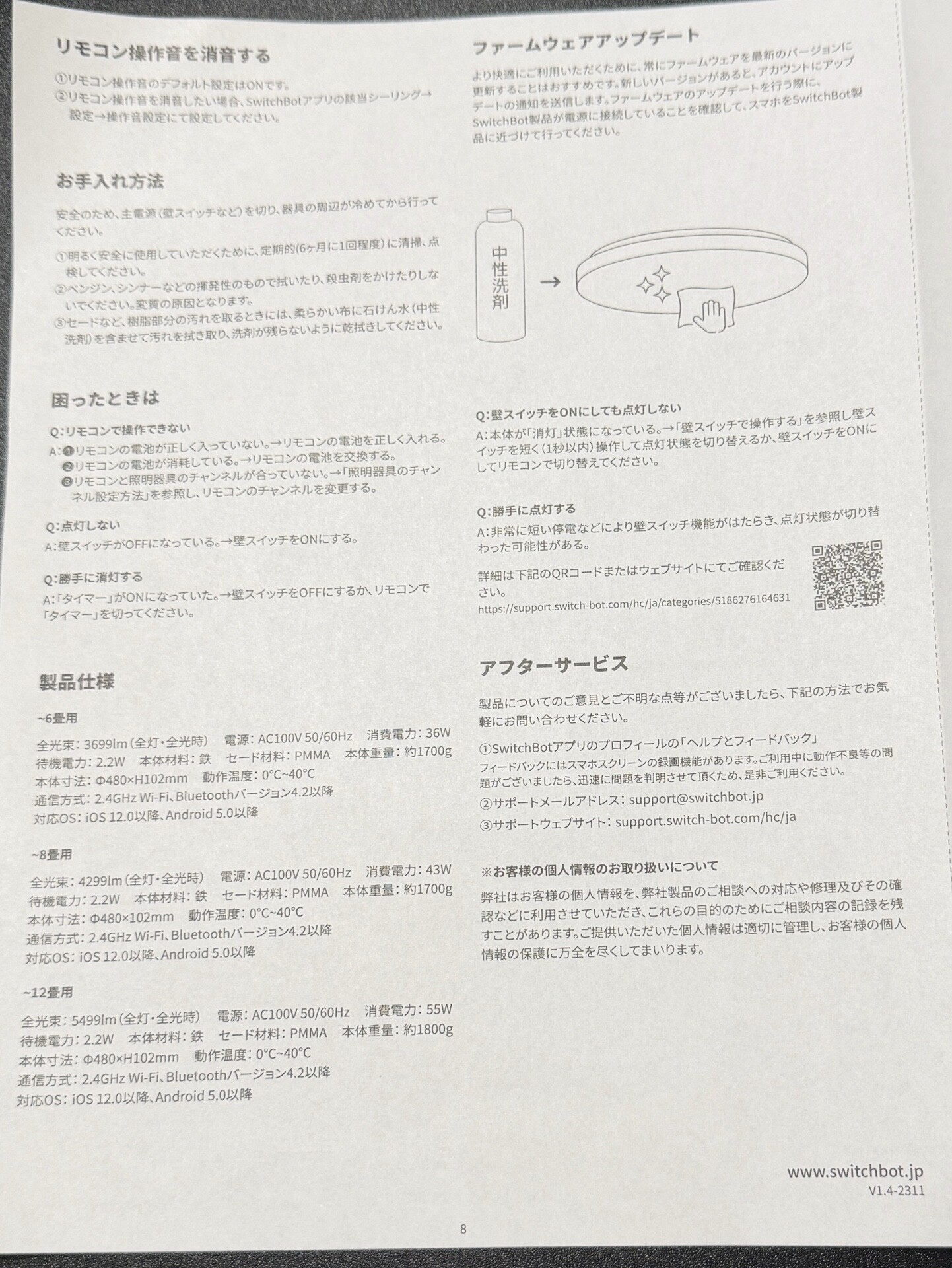 SwitchBot シーリングライトプロ 12畳 W2612250 取扱説明書。リモコン操作音の消音設定。製品仕様。ファームウェアアップデート。
