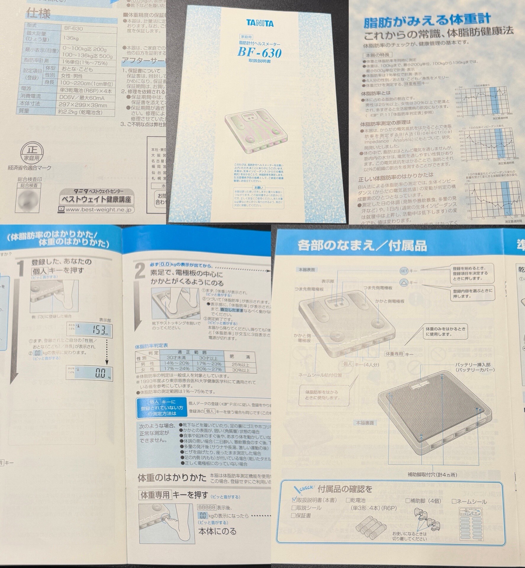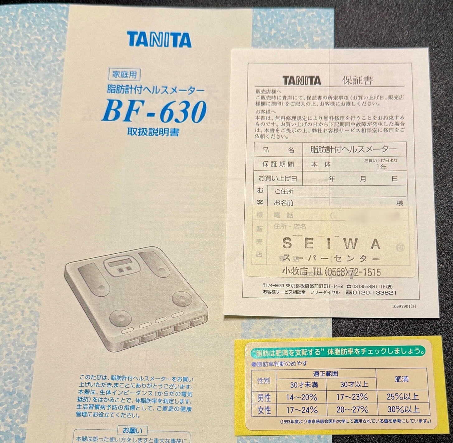 TANITA BF-630 取扱説明書。保証書の情報を見ると平成14年1月に購入しているっぽい。