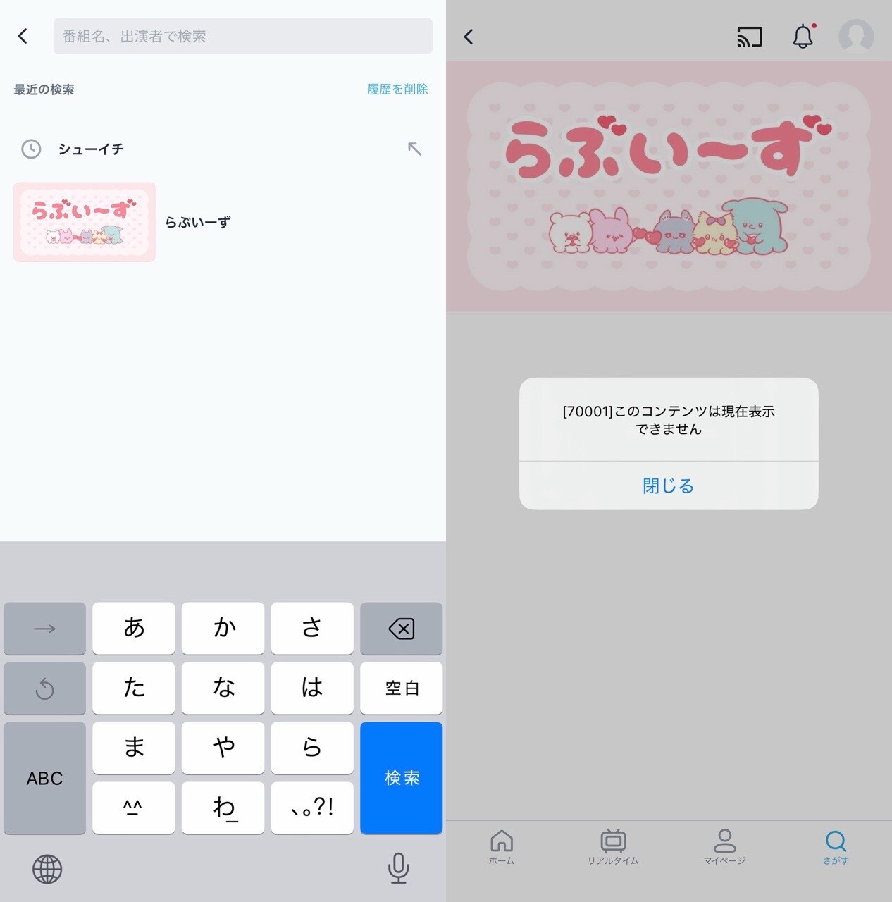 TVerで「らぶいーず」アニメが「シューイチ」に移動していた件。アプリの検索履歴から見ると番組TOP画像?はまだ残っているんだね。「[70001] このコンテンツは現在表示できません」と表示される。
