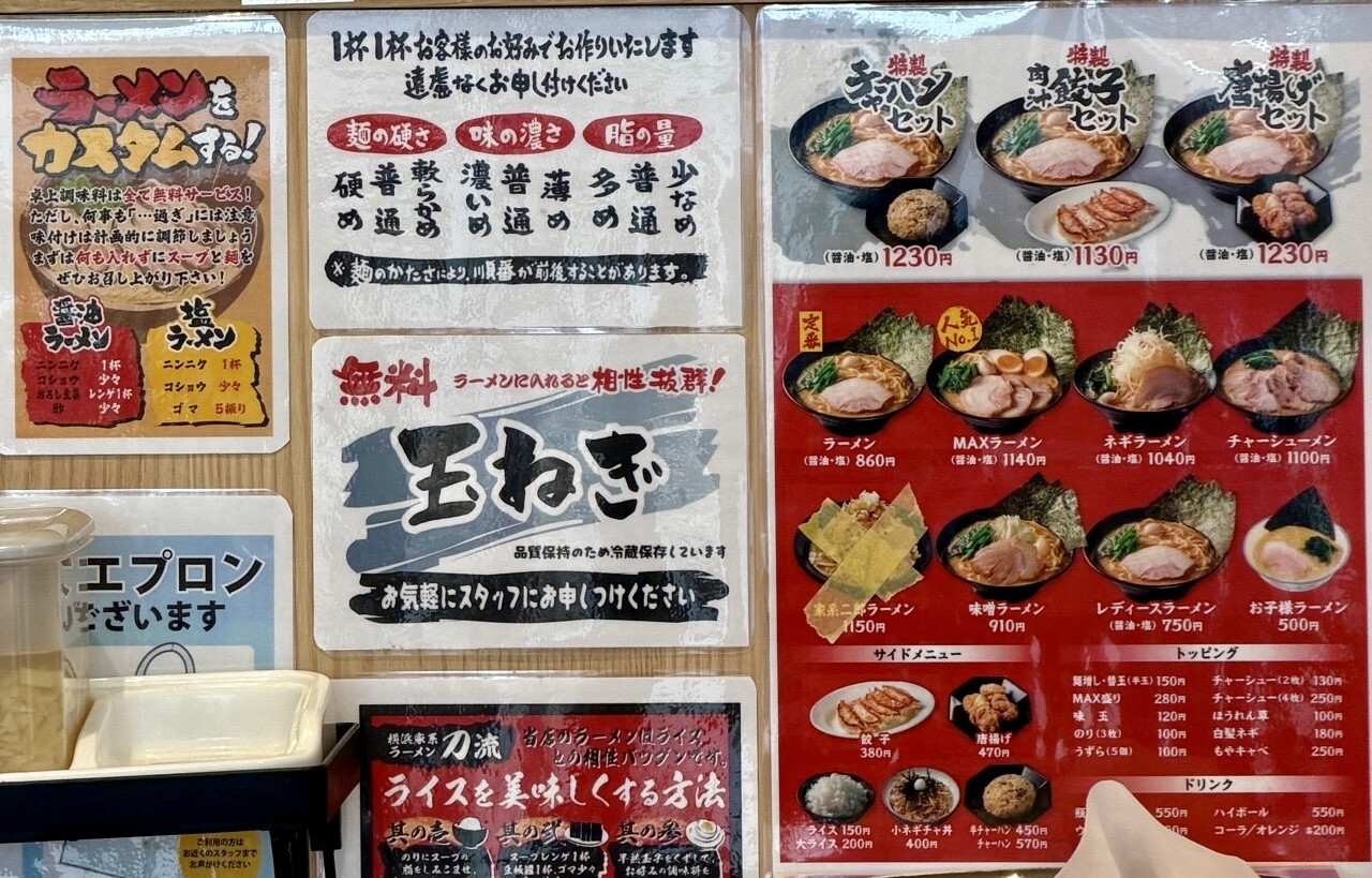メニュー。スープは醤油豚骨と塩豚骨。食券式。レディース何が違うのかわからない。入口付近に灰皿置くのはやめてほしいな。 (@ 横浜家系ラーメン刀 豊山店 in 豊山町, 愛知県) https://app.foursquare.com/share/checkin/69e45e12f02046620db16085?s=QxzESns9RJFAm1z3OFGlrOW707I&lang=en