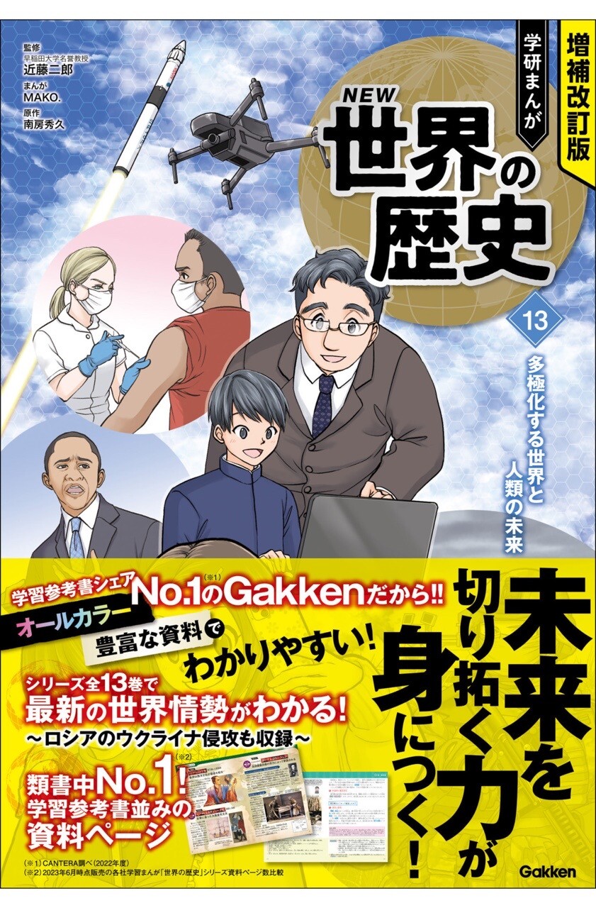「イラク戦争、ネット技術・文化の成長と変遷、アラブの春、難民問題、ロシアのウクライナ侵攻など、現代史をとりあげた13巻で、どこよりも最新の世界の歴史が学べます」 「特に今回、新たに13巻として、新型コロナウイルス感染症やロシアによるウクライナへの軍事侵攻など、現在でも私たちの生活に影響を与えている出来事も収録しました。新型コロナウイルスの感染拡大により、日本でも私たちの生活は一変してしまいました。強力な新型ウイルスの感染拡大や日本から遠く離れたウクライナにおける戦争が、私たちの毎日の暮らしに多大な影響を及ぼしています」 「世界の歴史は、人類が過去から、どのように行動してきたかを振り返り、現在や未来においてどう生きていくかを考えるヒントを与えてくれます。2022年から、高等学校の指導要領が改訂され、「歴史総合」という、新科目が追加されました。すべての高校生が履修するその内容は、近現代の歴史を日本史、世界史と区別することなく取り扱うものです。歴史は単なる暗記科目ではありません。世界の、歴史上の出来事には、背景や原因があり、そして、それにともなう結果があるのです」 増補改訂版 学研まんが NEW世界の歴史 公式サイト https://gakcomic.gakken.jp/extra/sereki/features/index.html
