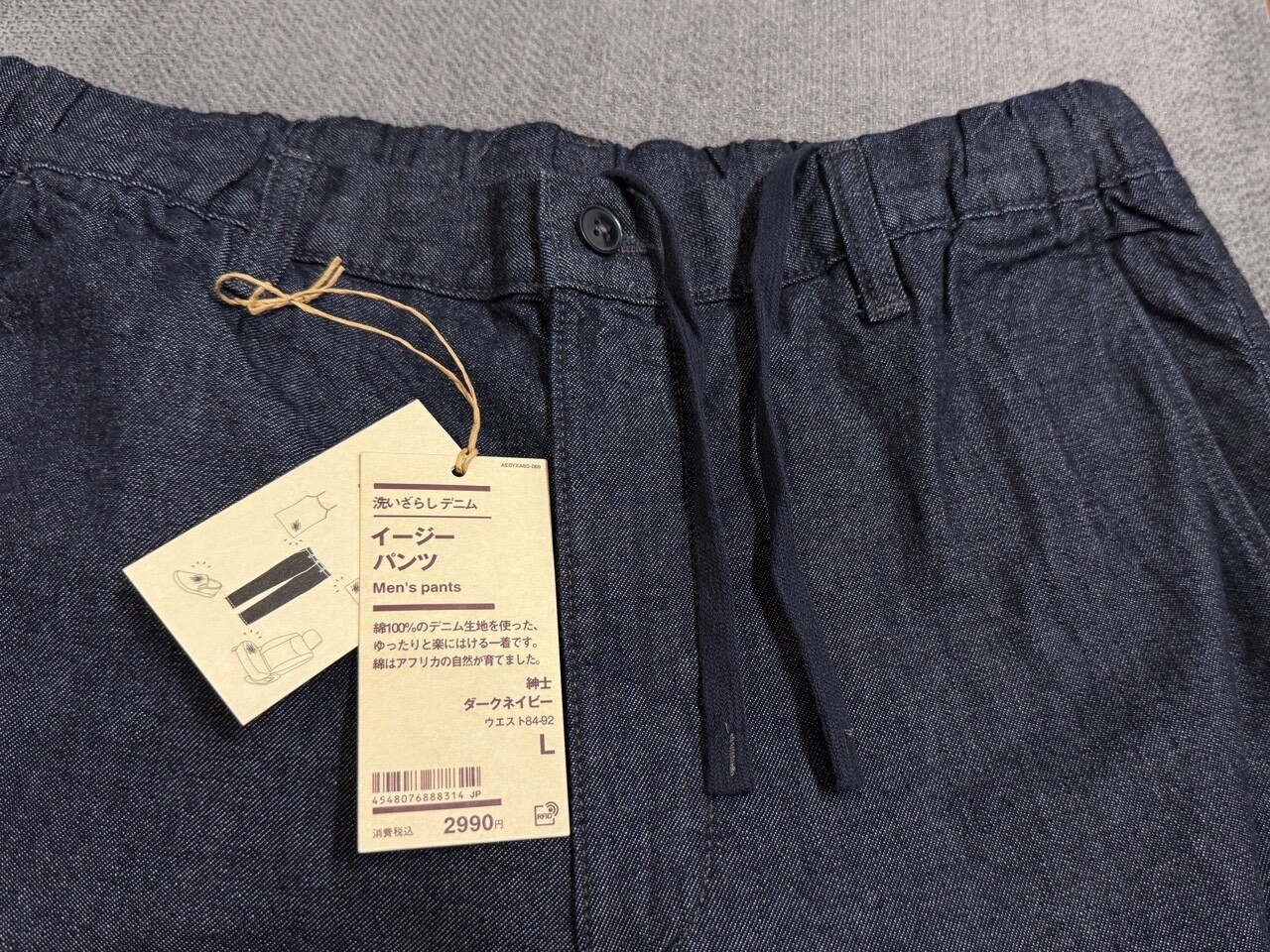 無印良品 洗いざらしデニム イージーパンツ。本体の素材は綿100%。ポケット袋布はポリエステル65%、綿35%。