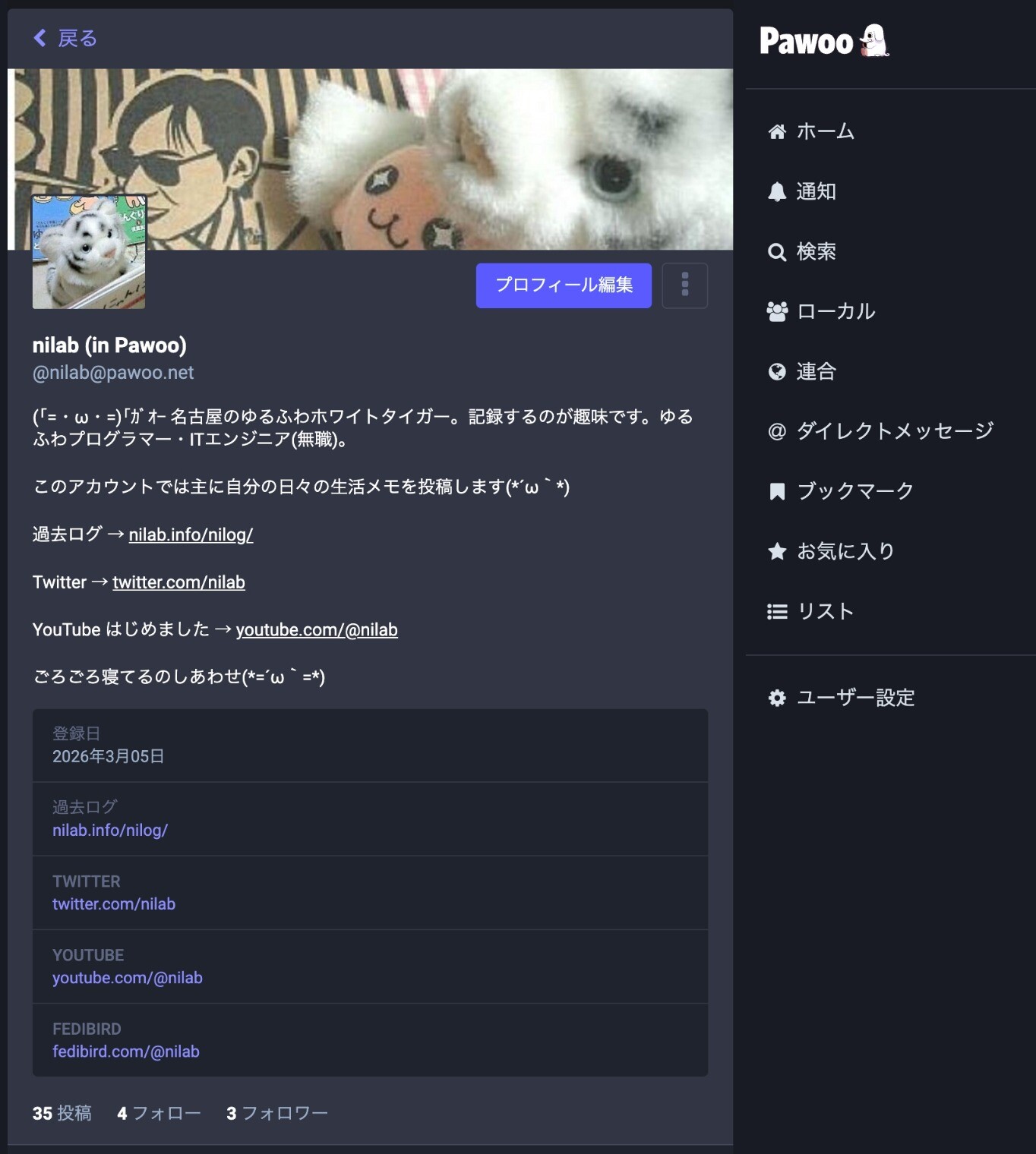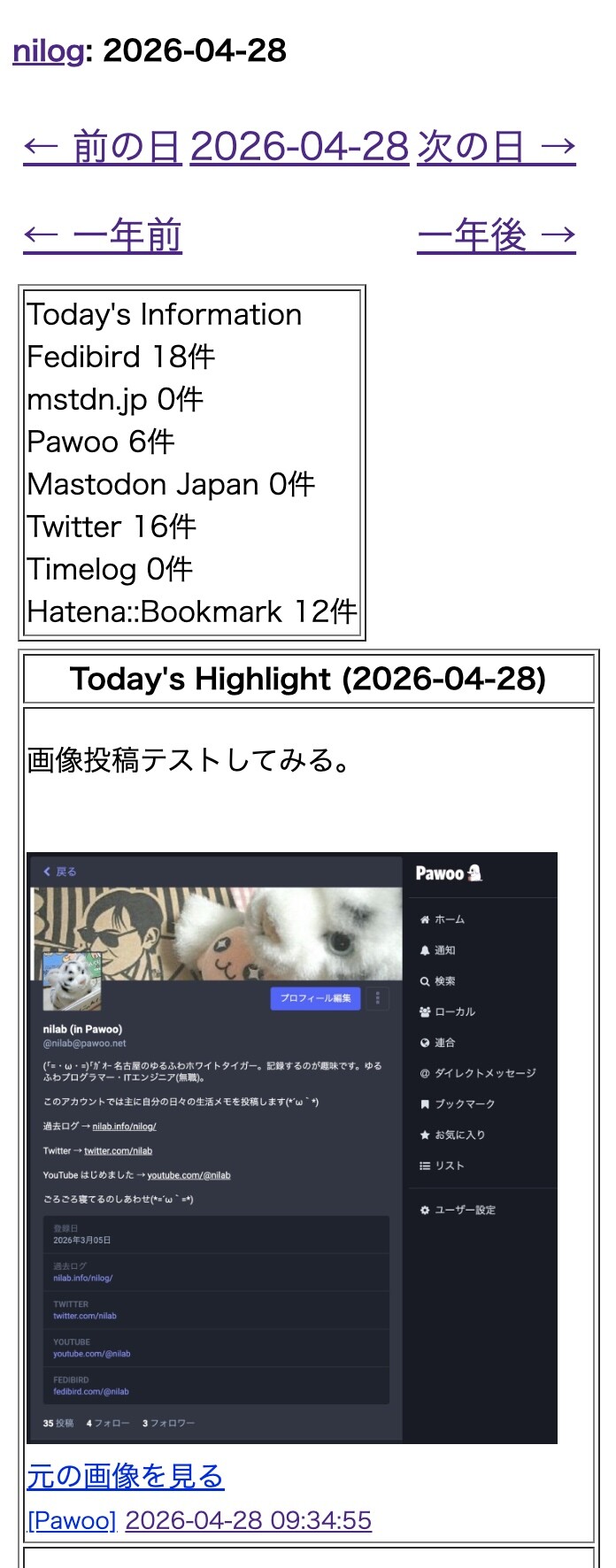 [ヅ]自分の Pawoo 投稿を nilog に表示するようにした (2026-04-28) http://www.nilab.info/z3/20260428_01_nilog_pawoo.html