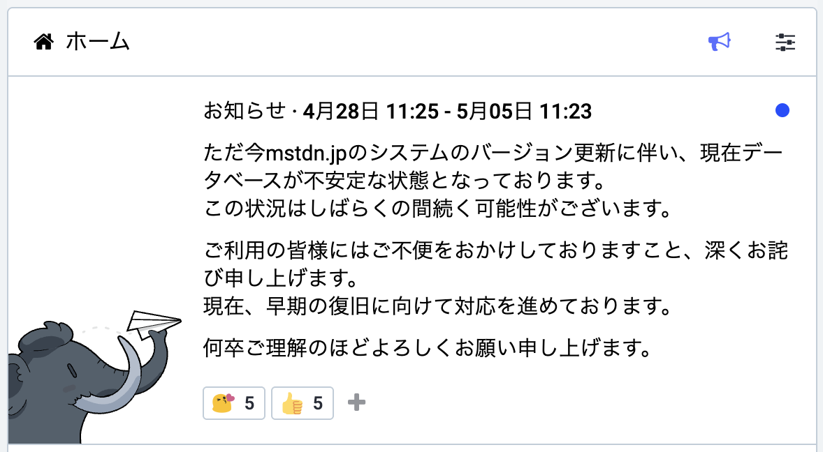 「4月28日 11:25 - 5月05日 11:23」「ただ今mstdn.jpのシステムのバージョン更新に伴い、現在データベースが不安定な状態となっております。」「この状況はしばらくの間続く可能性がございます。」