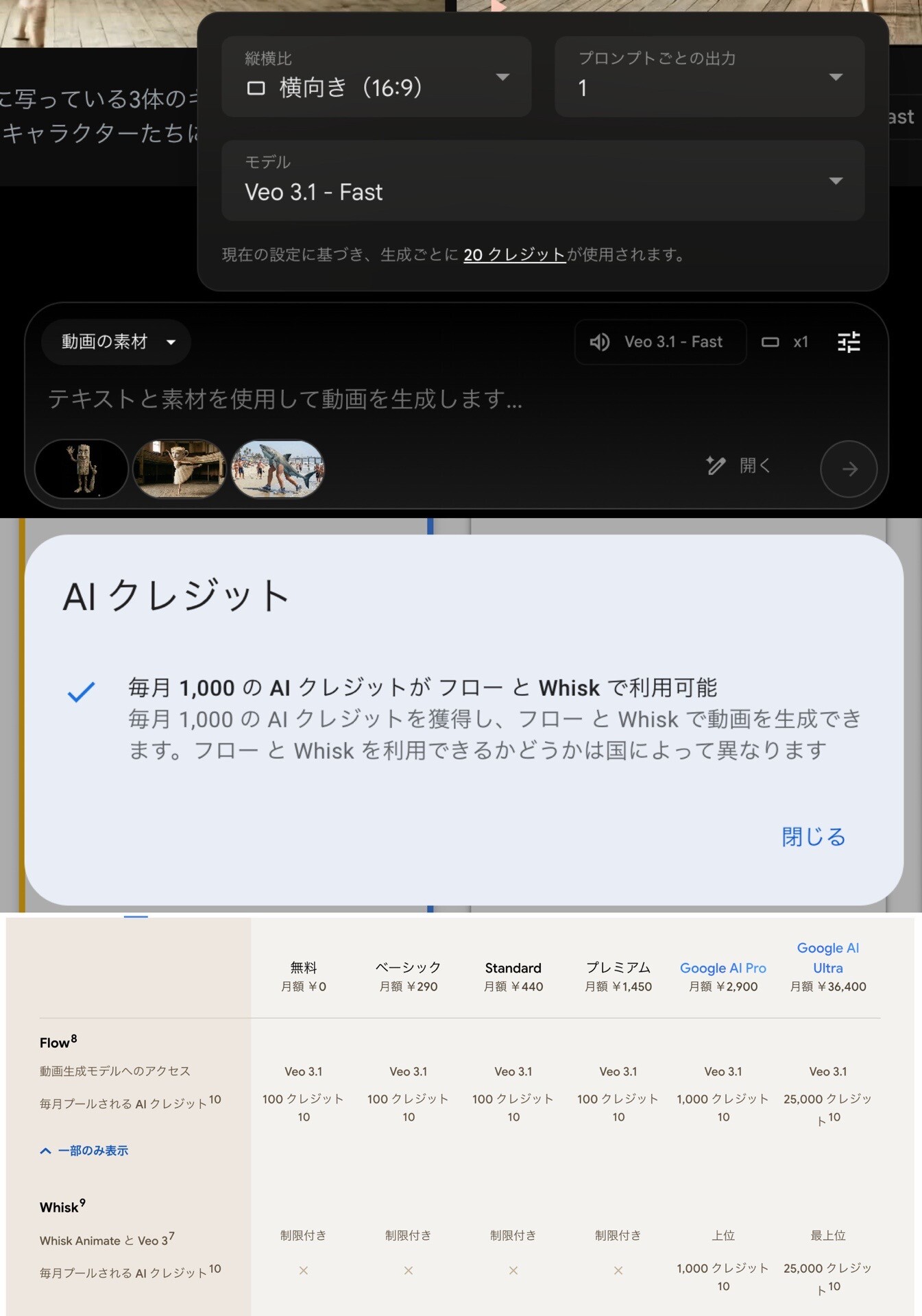 月額2900円の Google AI Pro プランだと、Gemini では1日に3つまでしか Veo 3.1 動画が作れない。Flow や Wisk だとクレジットがある限り作れそう。