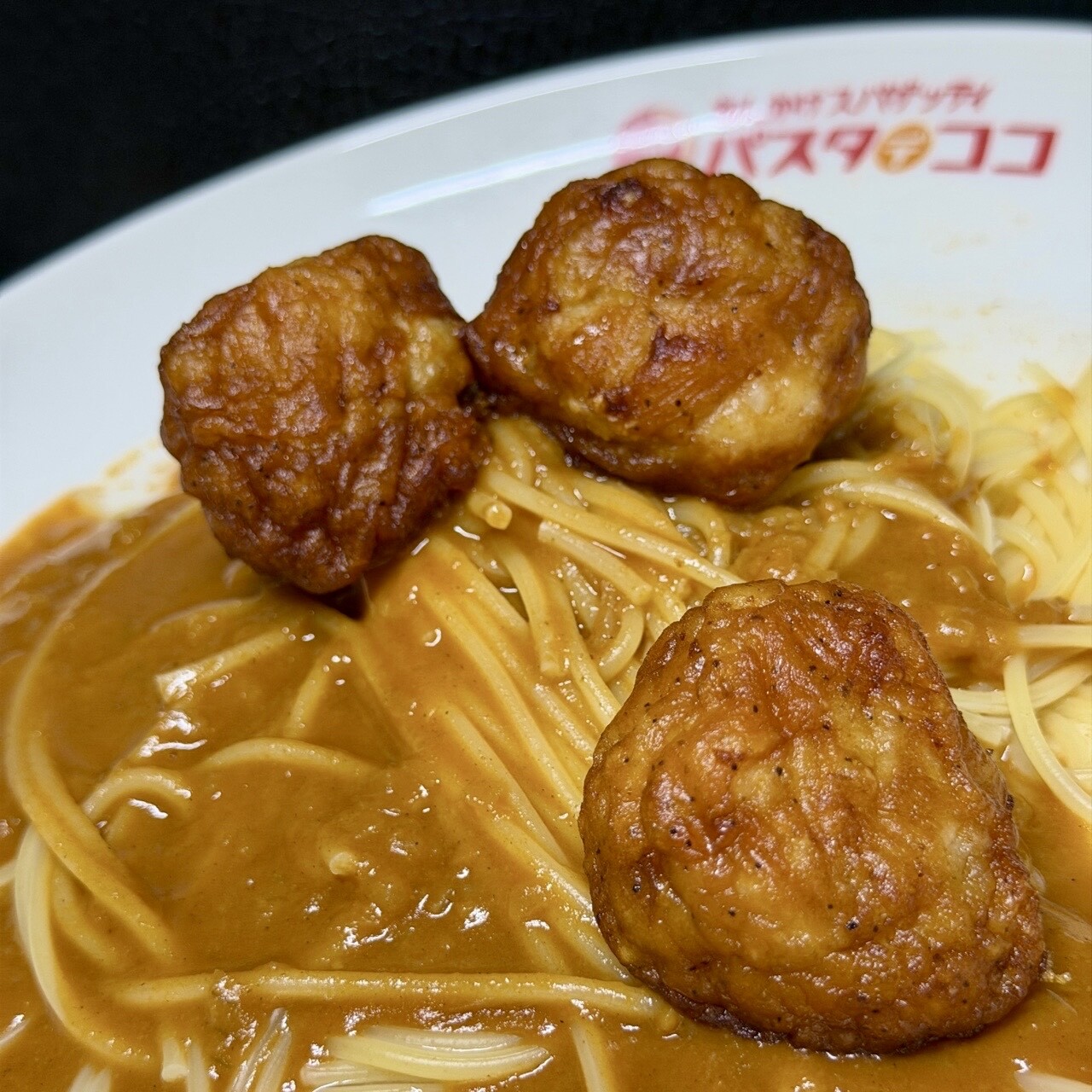 カレースパゲッティ(゚д゚)ウマー 茹でたスパゲッティに無印良品のレトルトカレーをかけて冷凍からあげレンチンしてトッピング。