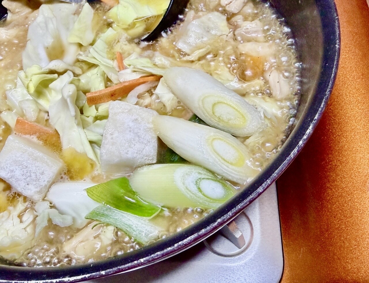 鳥塩鍋に凍ったネギと餅を入れる( ゚∀゚)