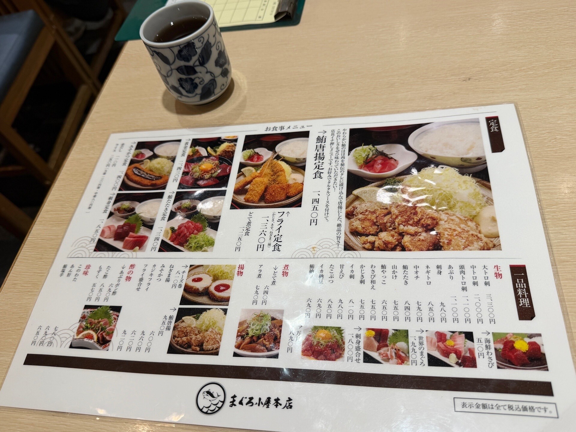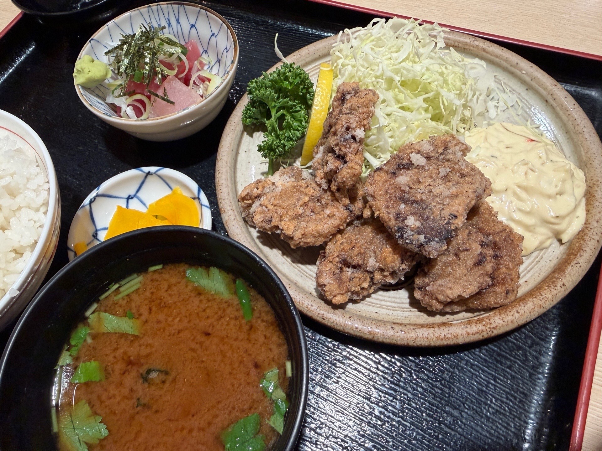 鮪小屋本店 鮪唐揚定食。まぐろの頬肉のからあげ、とても柔らかくて美味しい。タルタルソース付けても付けなくても美味しい。