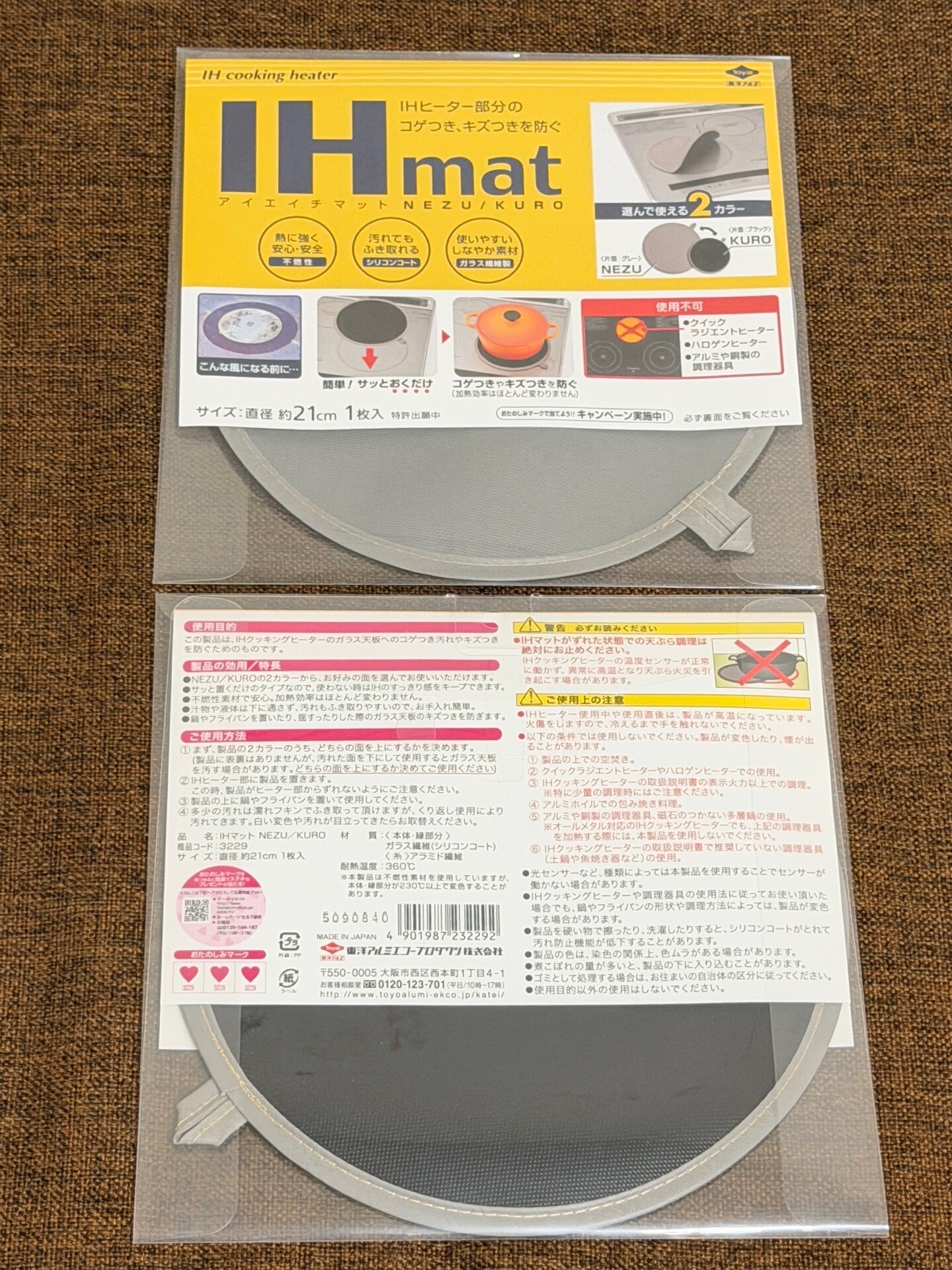 nilog: 東洋アルミエコープロダクツ お得用2枚入 IHマット NEZU / KURO 直径約21cm、Amazonにて1545円で購入。前回Amazonで買ったのが2021年3月なので、いままでのは2年半以上も使っていたんだろうか (Amazon以外で購入した可能性もある・・・)。灰色と黒色のリバーシブル仕様。耐熱温度360℃。 「本体重量:約30g」 「材質:本体・縁部分/ガラス繊維(シリコンコート)、糸/アラミド繊維」 「置くだけ簡単!熱に強く、加熱効率はほとんど変わらない」 「しなやかな素材で使いやすい!収納に便利なループ付き」 「汚れてもふき取れるので、お手入れも簡単」 東洋アルミ IH マット IHクッキングヒーター シート 水洗い グレー/ブラック 直径約21cm 2枚入 S3228 (2023-11-06) http://www.nilab.info/nilog/?type=m01&id=111363806228406969